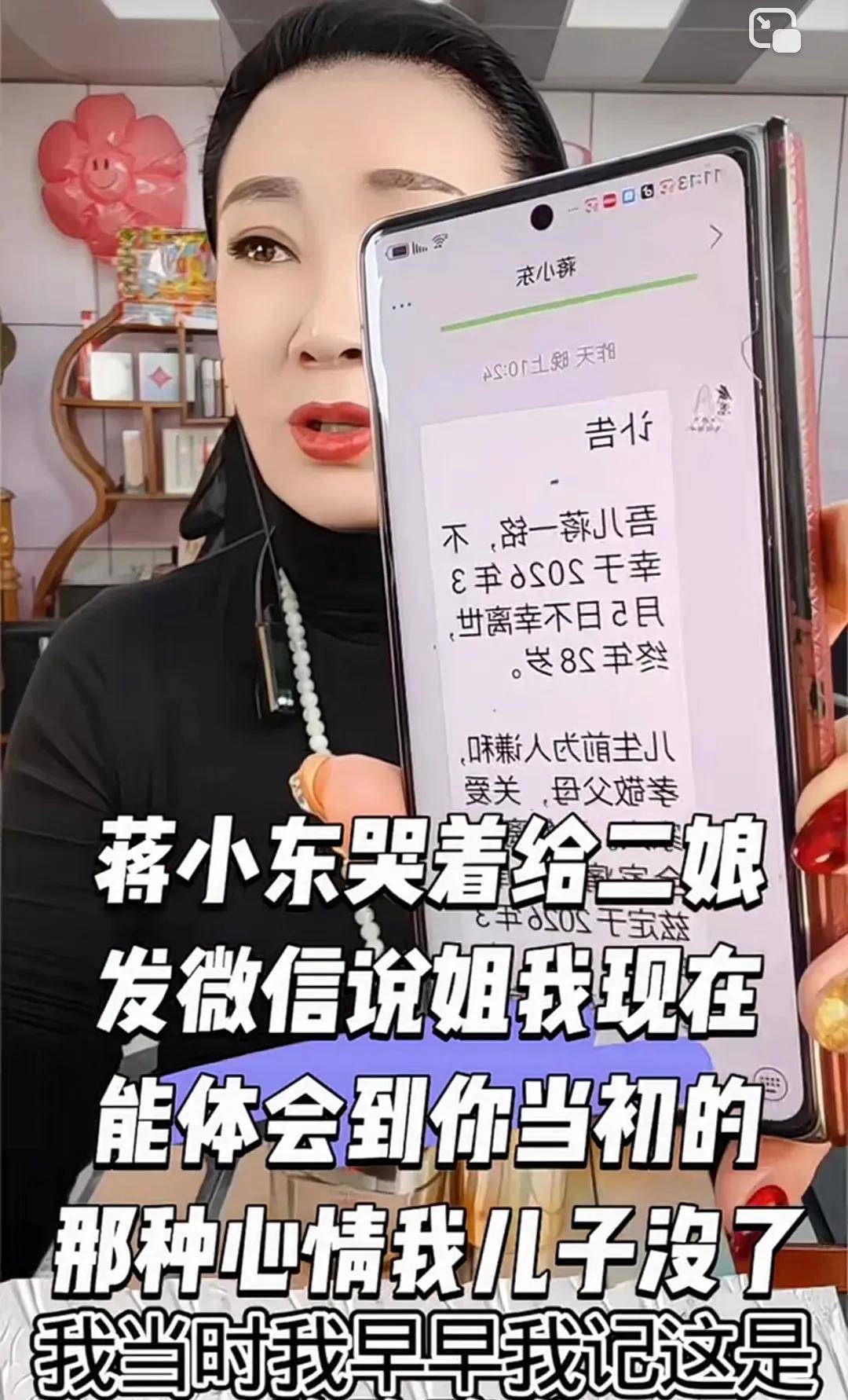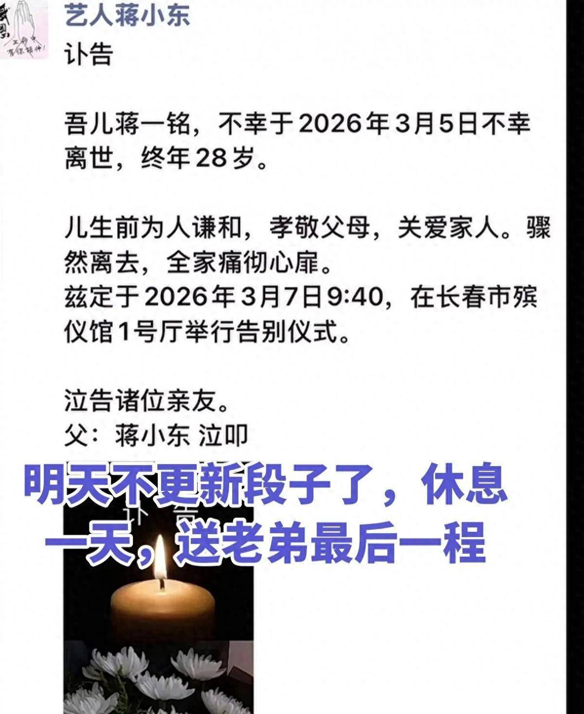 蒋小东在网络上发了个讣告,告诉大家他儿子不幸去世了,追悼会安排在3月7号上午9点40分,在长春殡仪馆举行。