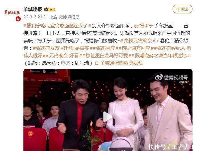 当其他央视主持人还在认真地读着稿子,严谨而标准地执行着自己的职责时,撒贝宁已经完全摆脱了传统主持人形象,端着一碗宜宾燃面,开始了他的吃播秀。3月3日晚间的2026年央视元宵晚会,撒贝宁的这一段沉浸式美食介绍,迅速点燃了全场的笑点,成为观众心中本届晚会最佳喜剧节目。