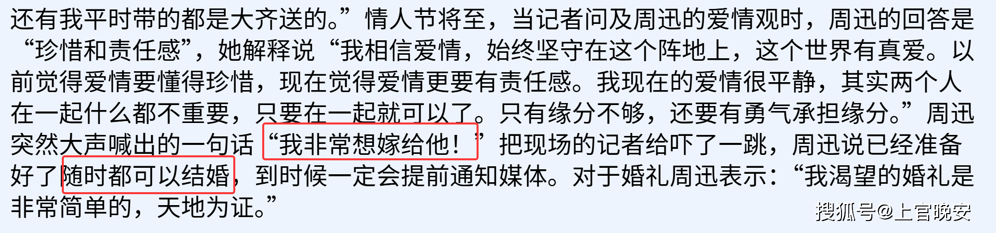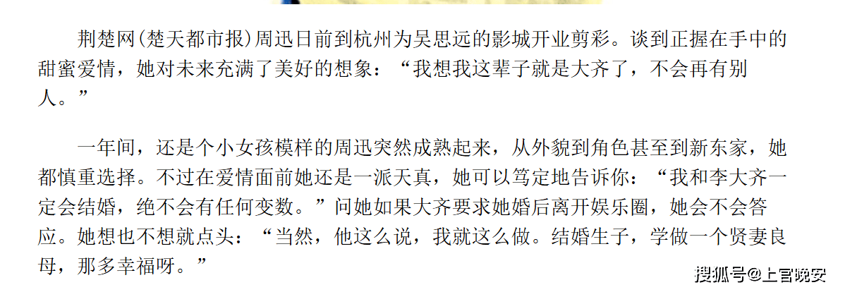 『周迅』笃定了要嫁给李大齐,并做好随时结婚做贤妻良母的准备。(从『周迅』的一些发言里看她确实是爱情大过天,难怪李少红说她是靠爱情去感知和认识这个世界的)