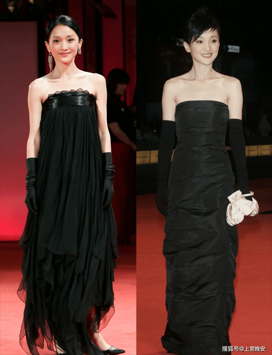 『周迅』的好多造型都是简约黑色系,看起来又利落又高级,有时候也有撞色的。这套红黑撞色搭配白手套🧤的经典造型是『周迅』凭借《如果·爱》拿下影后时期的。