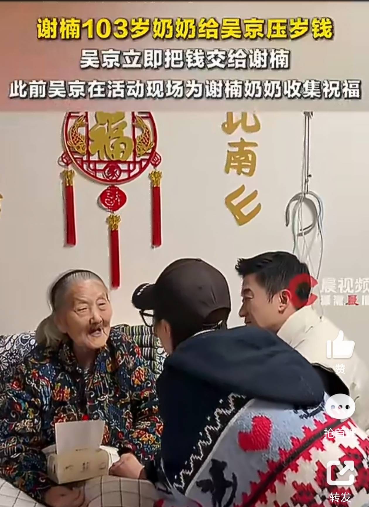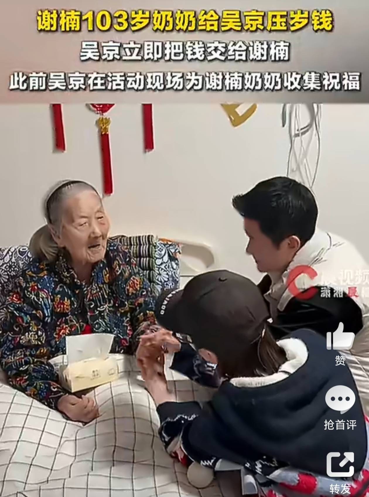 视频中,『吴京』和谢楠双双跪在奶奶床前磕头拜寿,奶奶则从枕头下掏出红包🧧塞给两人。令人忍俊不禁的是,『吴京』拿到压岁钱后,第一反应竟是立刻转身要交给谢楠,被谢楠笑着拦下:“这是奶奶给你的,自己收着。”这一幕让网友直呼:“战狼”在奶奶面前也是个乖宝宝,这家庭地位一目了然啊!