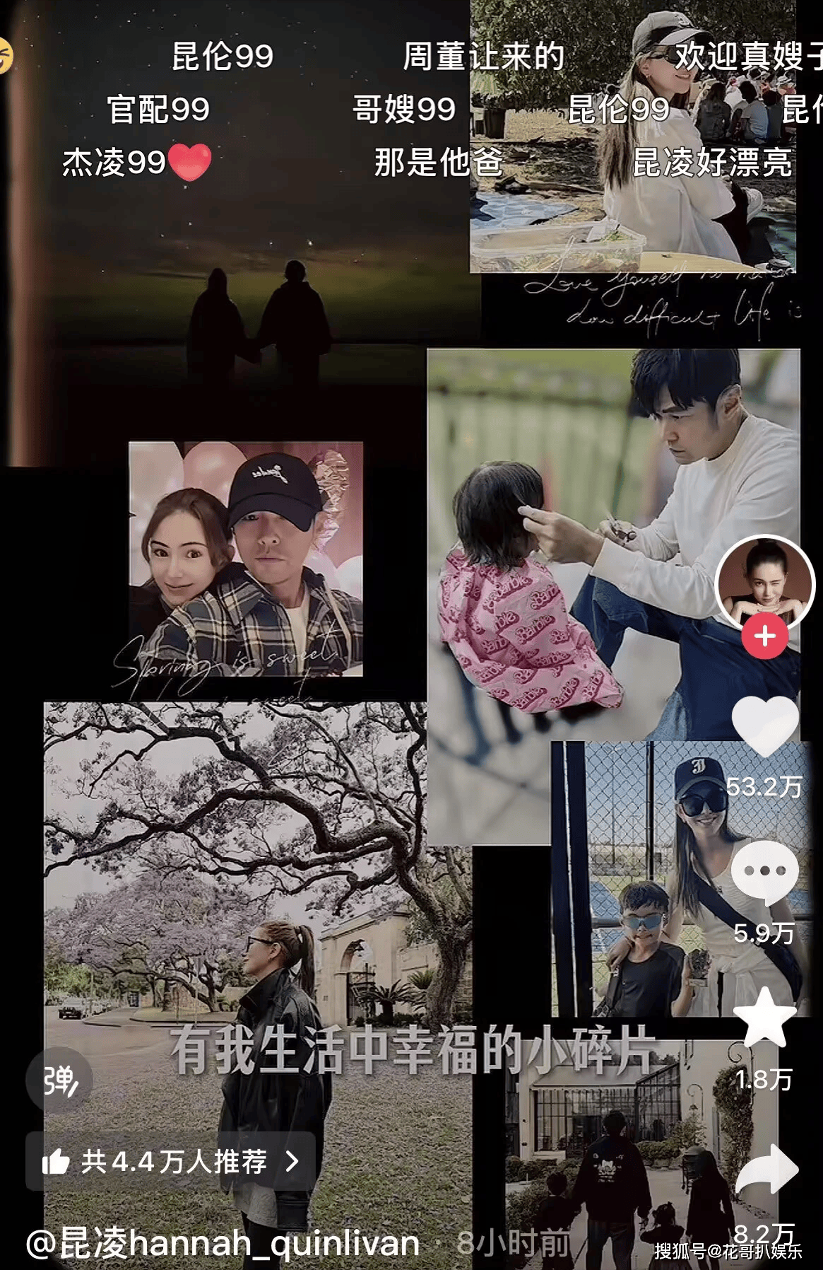 隔天『昆凌』注册了账号,发布的视频就是他们一家五口的照片和视频,还特意将她和『周杰伦』这么多年的点点滴滴剪成视频发了出来,给吃瓜群众喂了好大一口狗粮。和之前cp粉那些臆想糖截然不同,两人还发了共创,大大方方秀恩爱,『昆凌』大发嫂子瘾,也没有人敢说什么,毕竟人家是真嫂子。