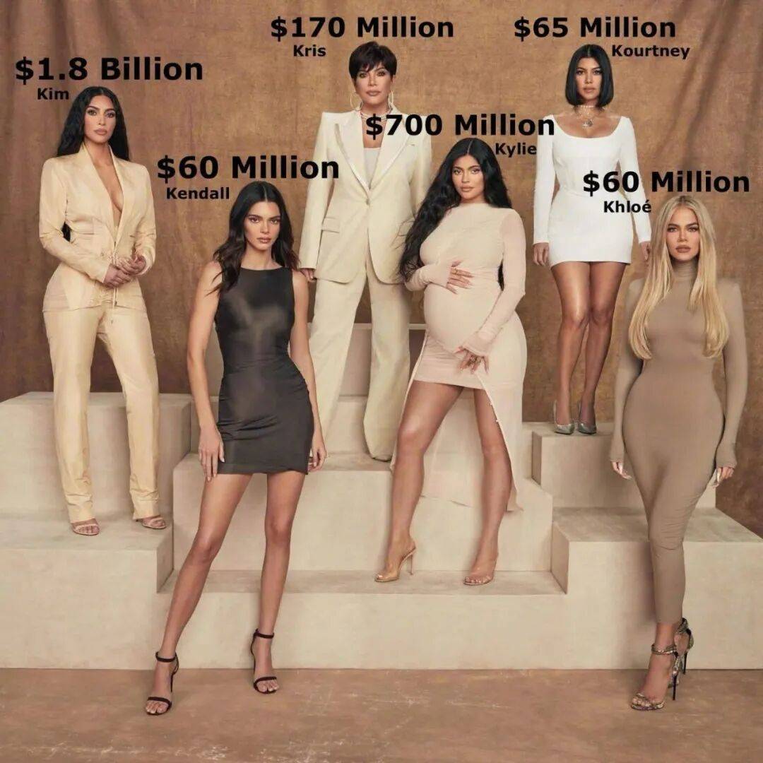 卡戴珊一家的身价!老妈克里斯1.7亿美元💵,大姐考特尼6500万美元💵,金姐18亿美元💵、科勒6000万美元💵,肯豆6000万美元💵,凯莉7亿美元💵。