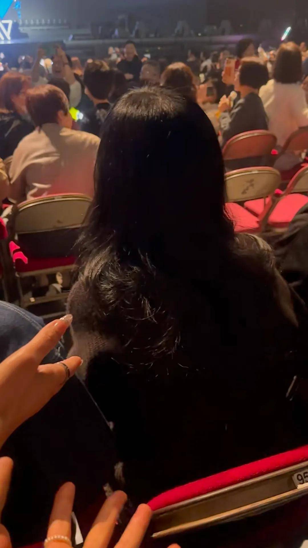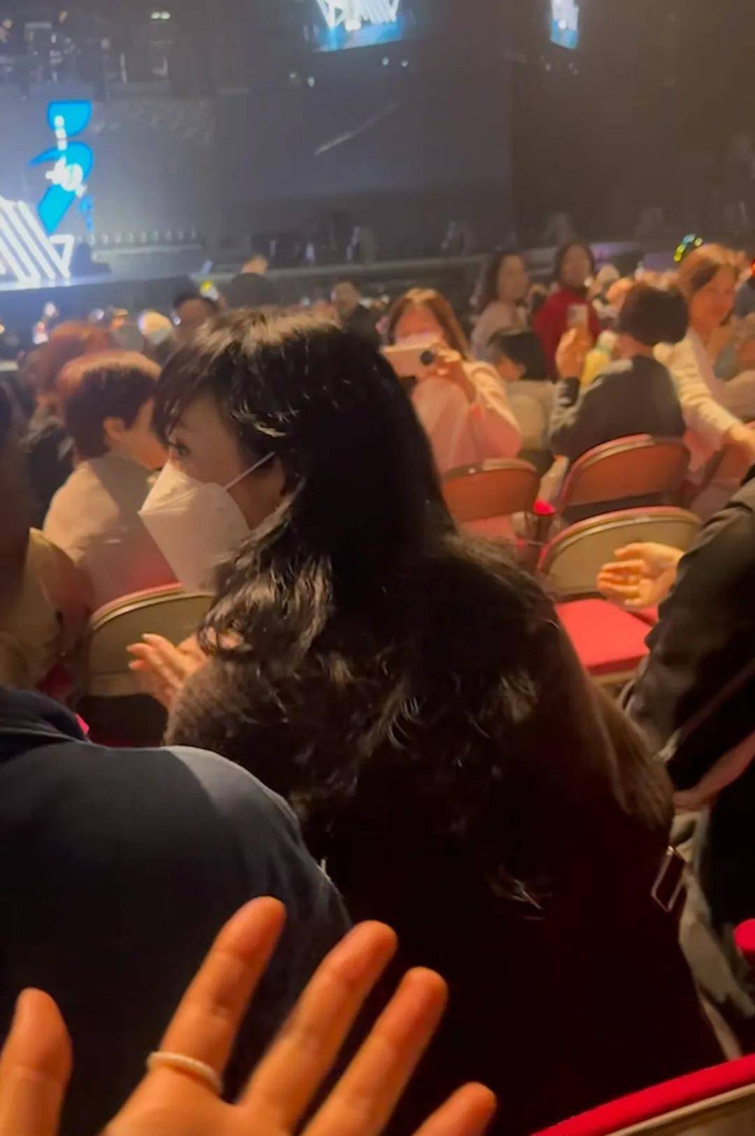 網民上載周慧敏在觀眾席的片段。周慧敏與友人坐在一起,她穿上黑衣,扭頭與身邊人一邊拍手一邊傾偈。周慧敏一頭濃密的黑長髮披散在肩上,單看背影已流露出仙氣,58歲的周慧敏身形亦Keep得好好。