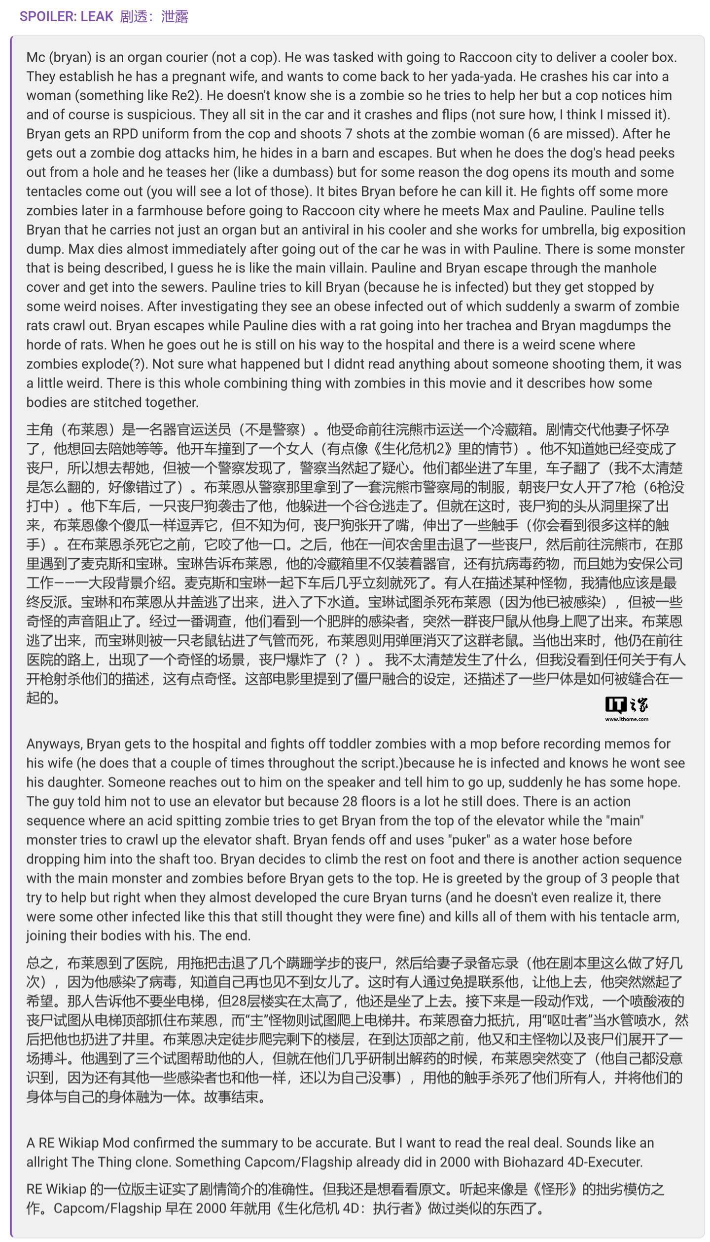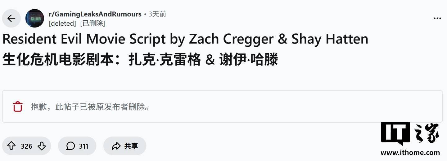 今日霍州 3 月 10 日消息,媒体 eurogamer 昨日(3 月 9 日)发布博文,报道称恐怖片导演扎克 · 克雷格(Zach Cregger)执导的新版《生化危机》电影剧本在 Reddit 社区曝光,随后由于版权©️原因被迅速删除,这一举动反倒增加了爆料的真实性。