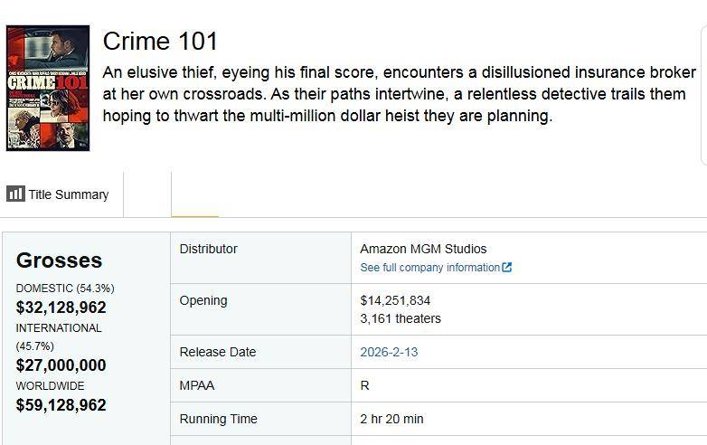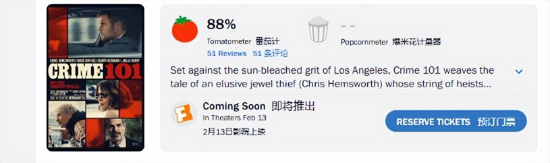 3月7日内地上映的好莱坞新片《洛杉矶劫案》,像一颗被市场忽略的遗珠——投资近亿美金,首日票房仅数百万,全球总票房刚过六千万,即便“雷神”“绿巨人”等卡司加持也难挽颓势,大概率难逃亏损命运。但口碑却意外坚挺:烂番茄88%好评、IMDB7.1分,被影评人称作《盗火线》的精神续作,甚至被赞为“GTA系列最贴实景的犯罪呈现”。