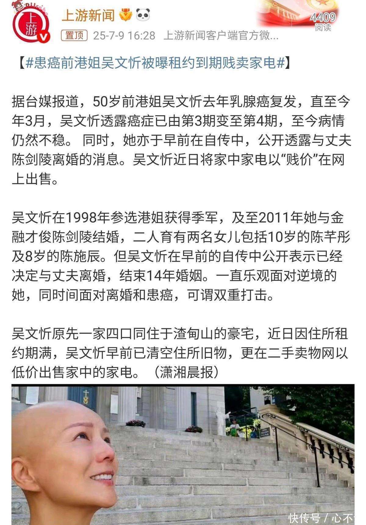 婚姻的承诺,在面对绝症时,犹如一张脆弱的废纸,随便一撕便支离破碎。而第一个真正体会到这种脆弱感的,正是51岁的前港姐吴文忻。根据港媒的报道,她正在与乳腺癌四期顽强斗争,而她此时所经历的,不仅是身体上的痛苦,更是精神上的双重折磨:一方面,癌细胞蔓延,让她的胸口伤口日渐溃烂、流脓,发出她自己形容的酸腐死亡气味;另一方面,结婚14年的丈夫在她最需要支持的时刻,收拾行李毫不犹豫地离开了她。