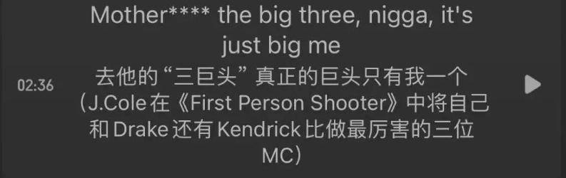 毕竟,上一个说自己不是Top3,而是Big1的男人,还是Kendrick Lamar:"Mother fxxk the big three,nigga,it's just big me!"(去tm的三巨头,真正的巨头只有我一个人!)