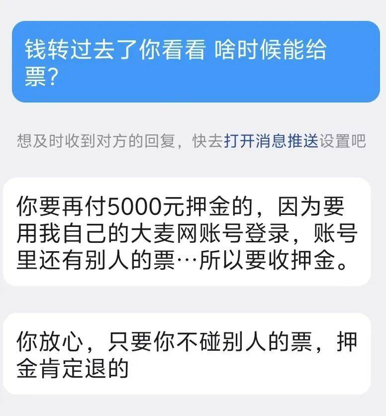 “你稍等一下,还不能登录。”对方突然叫停,“我那个大麦账号里不只有你的票,还有好几个客户的票都在包里。我怕你登录进去不小心乱动,把别人的票搞没了。这样,你再付5000元押金,保证不动账号里的东西,等你们看完演出,押金原路退回。”