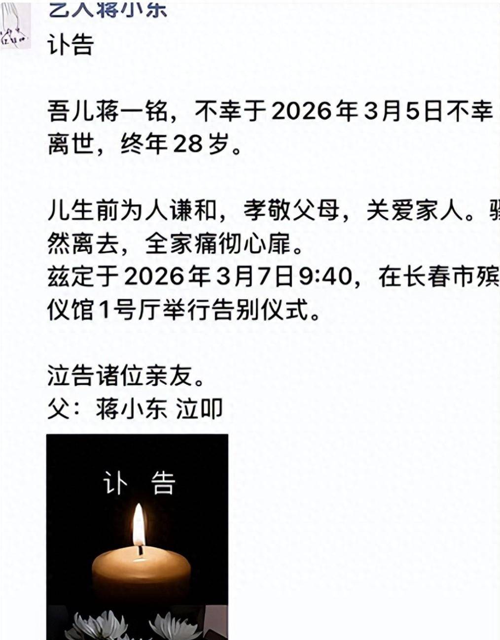 2026年3月5日凌晨,二人转演员蒋小东的独生子蒋一茗从长春某楼的17楼一跃而下,永远离开了这个世界。年仅28岁的他,未曾结婚,也没有家庭,却就这样离开了,留下了鬓发渐白的父亲,以及依旧在外地演出的母亲,和一纸令人生痛的讣告。