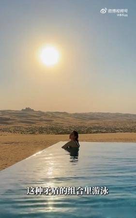她住的这家酒店是《沙丘》电影的拍摄地点,别人来了就只是拍个照片打个卡,可她不这么认为,她说沙漠和游泳池放在一块儿,看着有点冲突,但实际挺浪漫的,这趟出行不像是普通旅游,更像是她在寻找一种新的体验方式,她也不是为了追星,而是把电影里的场景当成自己可以走进去的幻想世界。