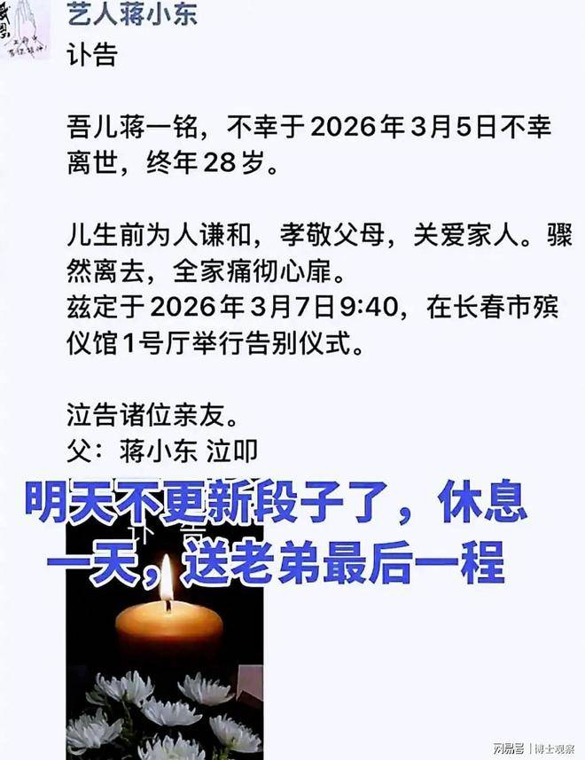 2026年3月7日,对于东北二人转演员蒋小东来说,是他人生中最黑暗的一天。这一天,他不得不以最沉痛的方式,将一个令人心碎的事实公之于众:他年仅28岁的独生子蒋一铭,于3月5日不幸离世。告别仪式定于3月7日上午9点40分,在长春殡仪馆举行。讣告虽言辞简短而克制,但那全家痛彻心扉六个字,却如千钧之重,承载了一个父亲在白发人送黑发人时的绝望与无助。消息传出,整个二人转圈子为之震动,无数曾被他逗笑的观众,此刻也沉浸在深深的惋惜与悲痛之中。