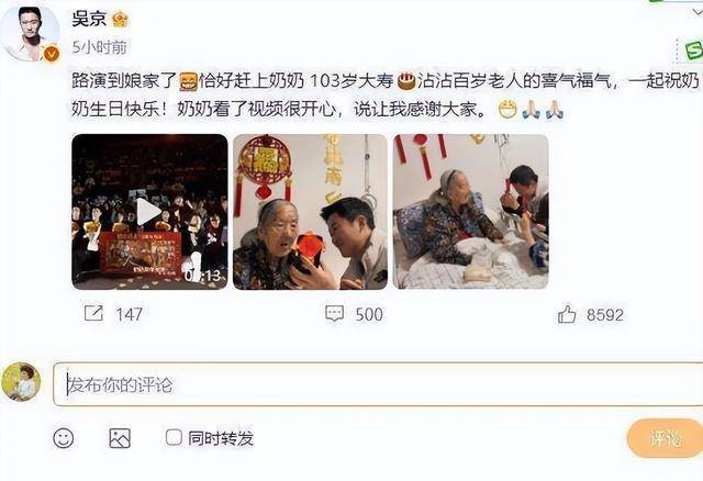 『吴京』并没有把孝顺当作一项任务。在2026年奶奶百岁的时候,他将俩个儿子从横店带回合肥,尽管老大因为晕车一路呕吐,『吴京』依然拿着矿泉水瓶在旁边耐心地擦拭,还边擦边说:“你吐你的,太奶奶必须看见你。”拍《