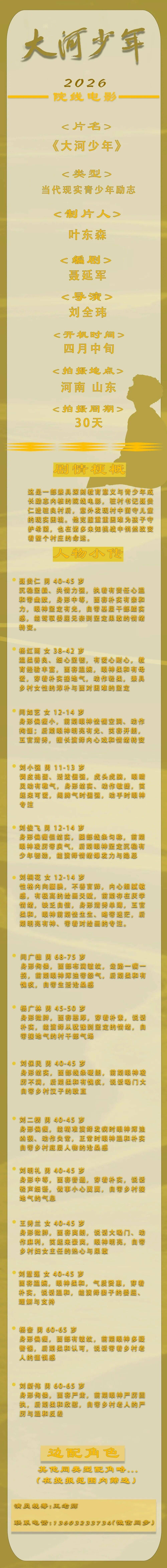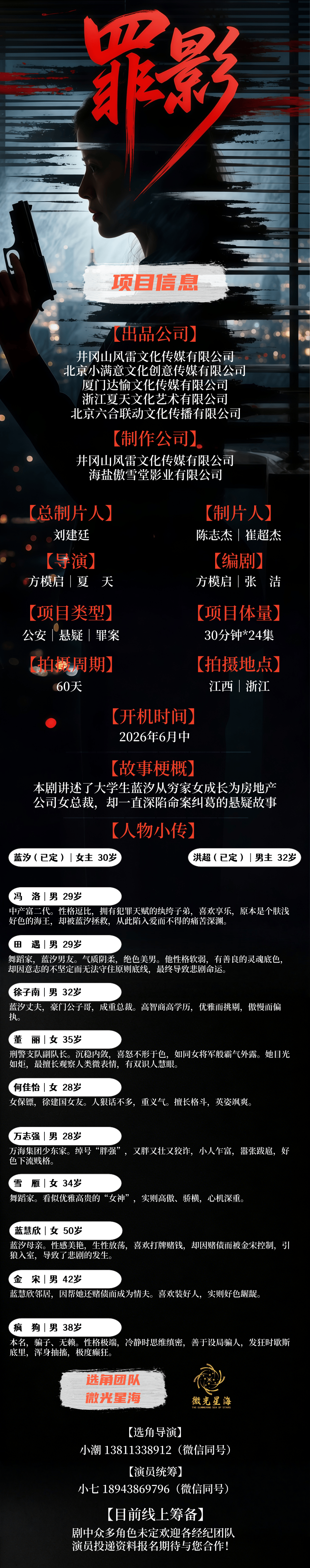 剧中大量人物角色未定,欢迎诸位演员及经纪人朋友踊跃投递资料,期待与您合作。