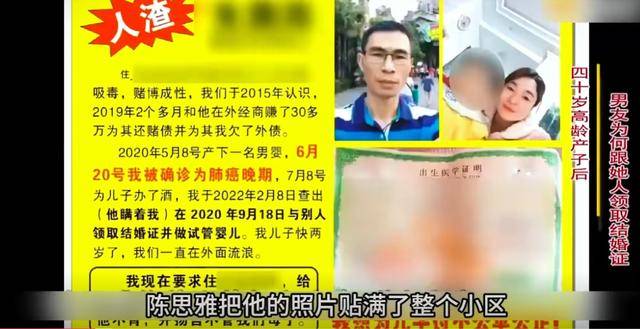 陈思雅今年42岁,在她40岁时,冒着生命危险剖腹产为男友刘宇杰生下了一个儿子。然而,命运却给了她一个更加残酷的打击。刚刚迎来孩子的诞生,陈思雅便被确诊为肺癌。更令她心寒的是,男友刘宇杰不仅在孩子出生后抛弃了她们母子,还很快转身与另一个女人结婚,抛开了曾经的诺言。
