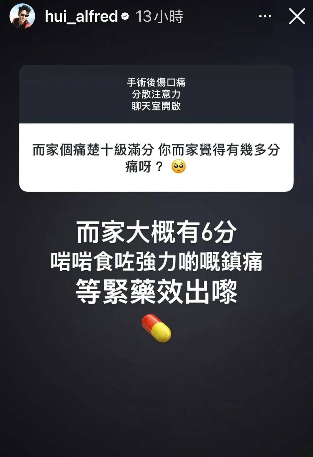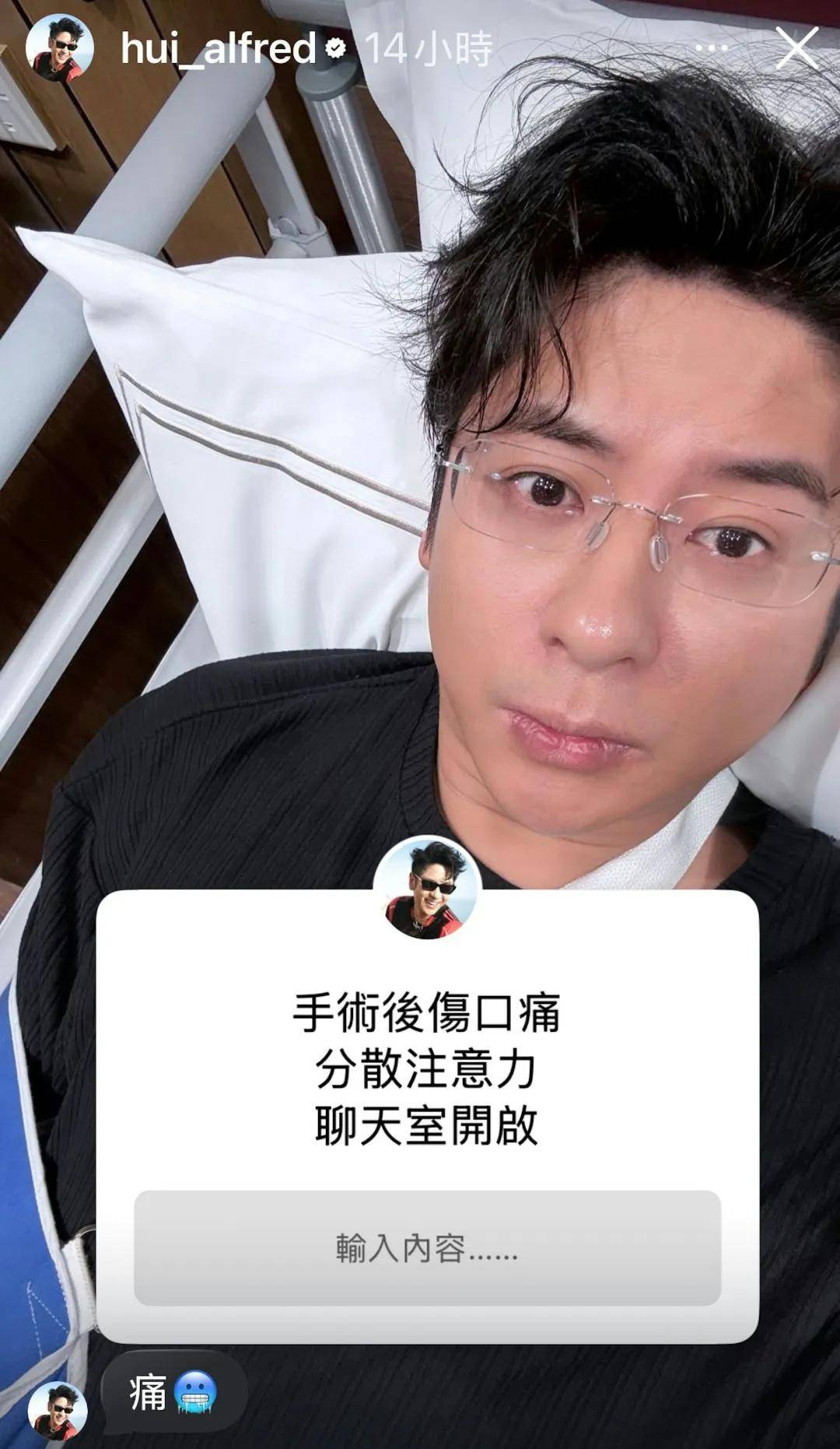 完成演出後,許廷鏗終於安排入院開刀,昨晚他在病床自拍🤳上載至 IG 限時動態,畫面所見他戴著眼鏡、躺在病床上,左手以吊帶托高,神情略帶倦容。配圖文字寫上「手術後傷口痛、分散注意力、聊天室開放」,主動開放提問箱,邀粉絲陪他傾偈,藉此轉移對傷口痛楚的注意力。