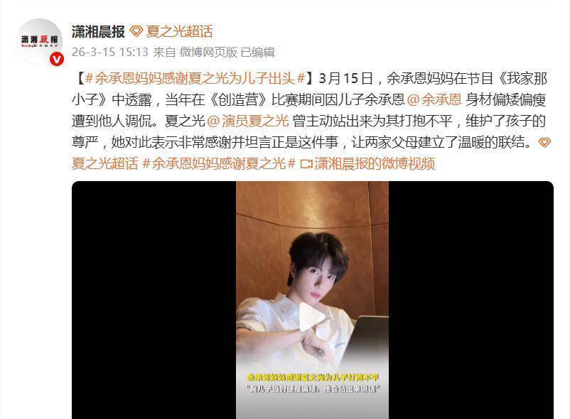 有些综艺片段,热闹看完就过去了。有些只是一闪而过,却会在很多年后突然回到公众视野。3月15日报道提到,《我家那小子2026》里的一段旧事被重新翻出:余承恩妈妈当着镜头感谢夏之光,还说自己当年给他投过票。说白了,不是因为舞台有多炸,而是因为7年前,他替余承恩挡过一次难堪。