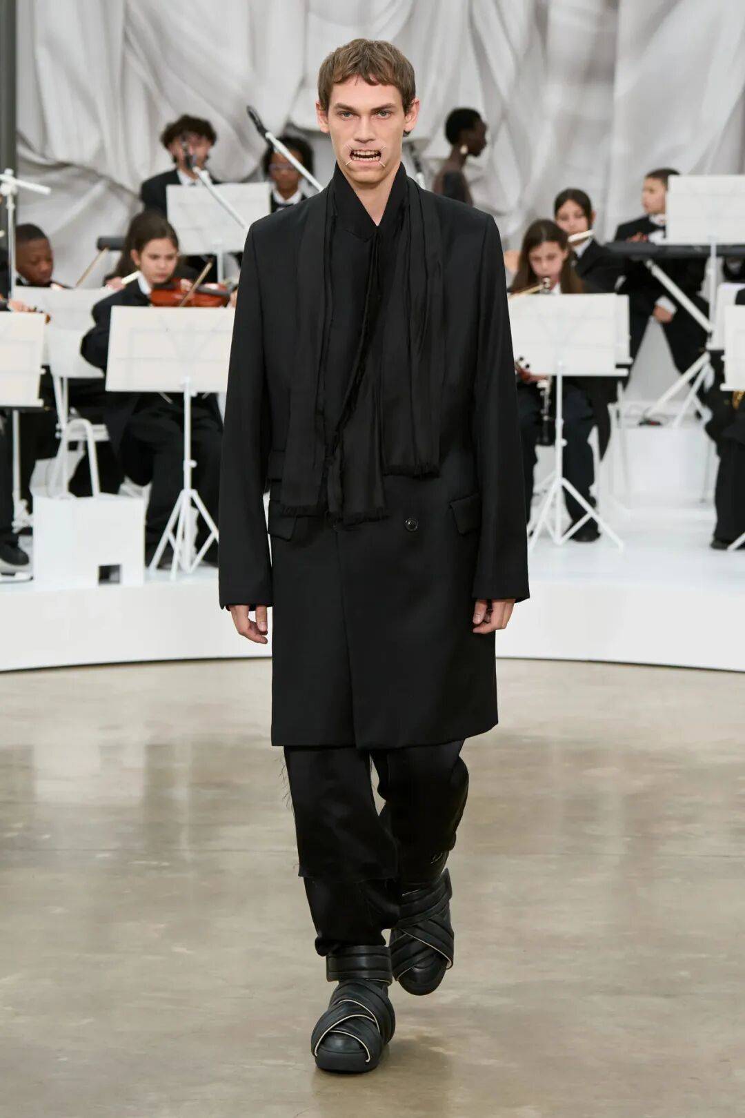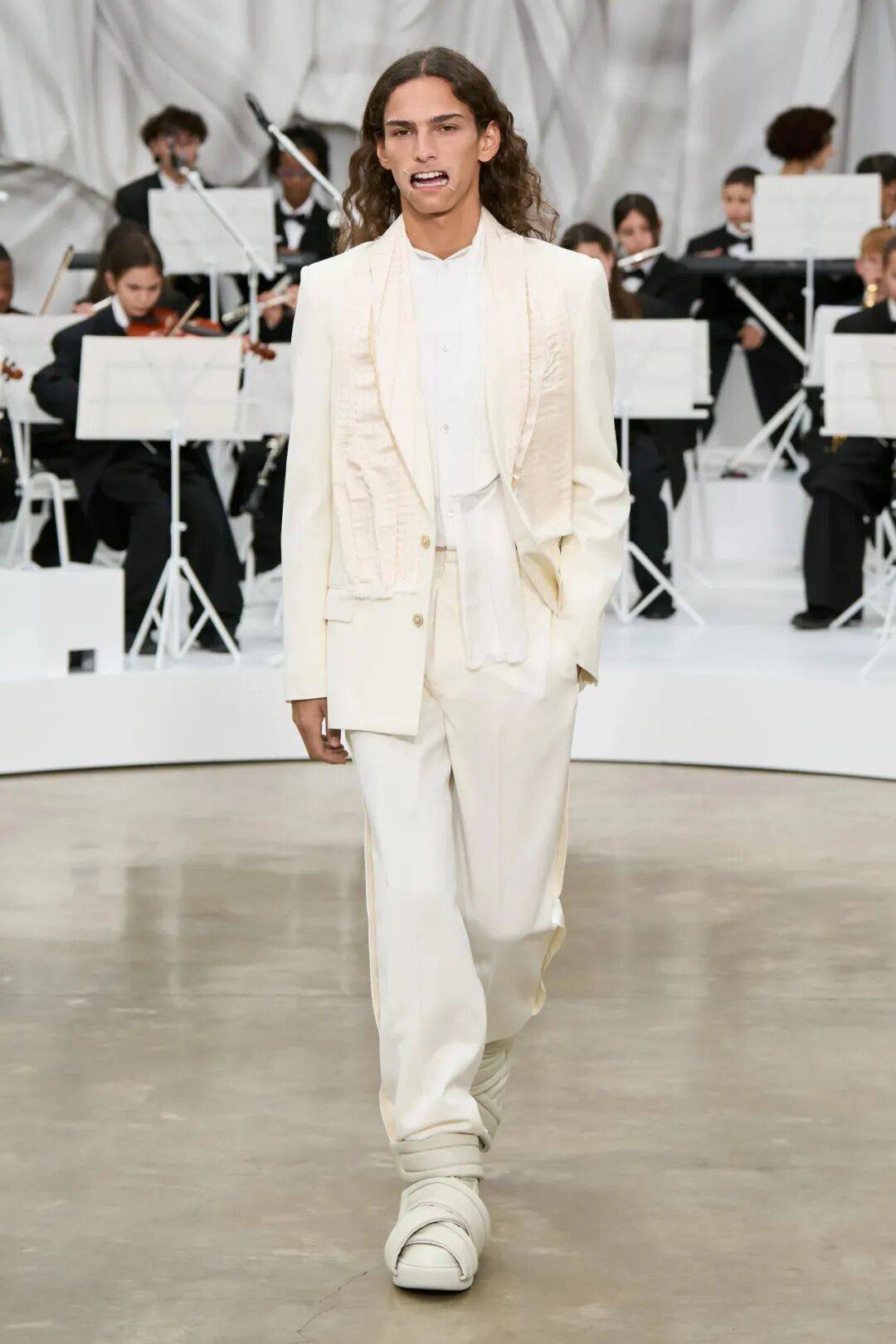 在Martens 的服装系列中,Future 以新的形式出现,与弹性材质、透明化处理和解构元素同步,显示它已经成为品牌语言的一部分,而不是一个独立产品,在材质塑形、透明处理、未来主义鞋履上的动作,表明他的Margiela 将继续推进实验性。