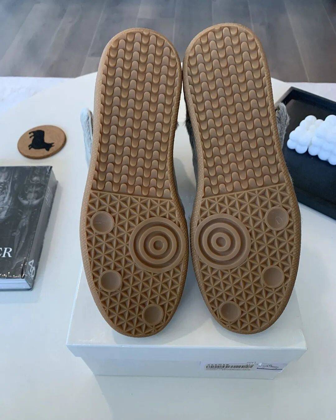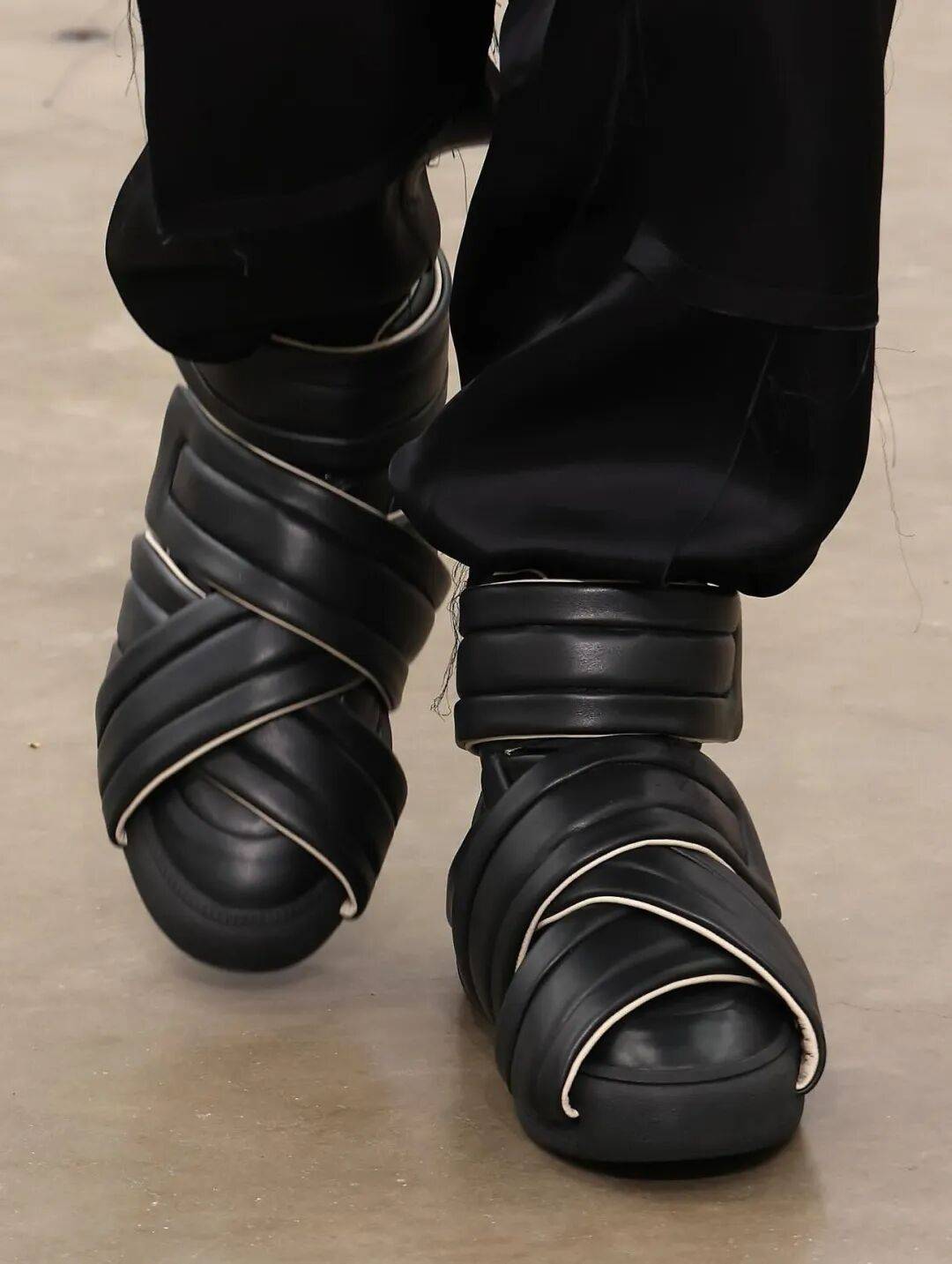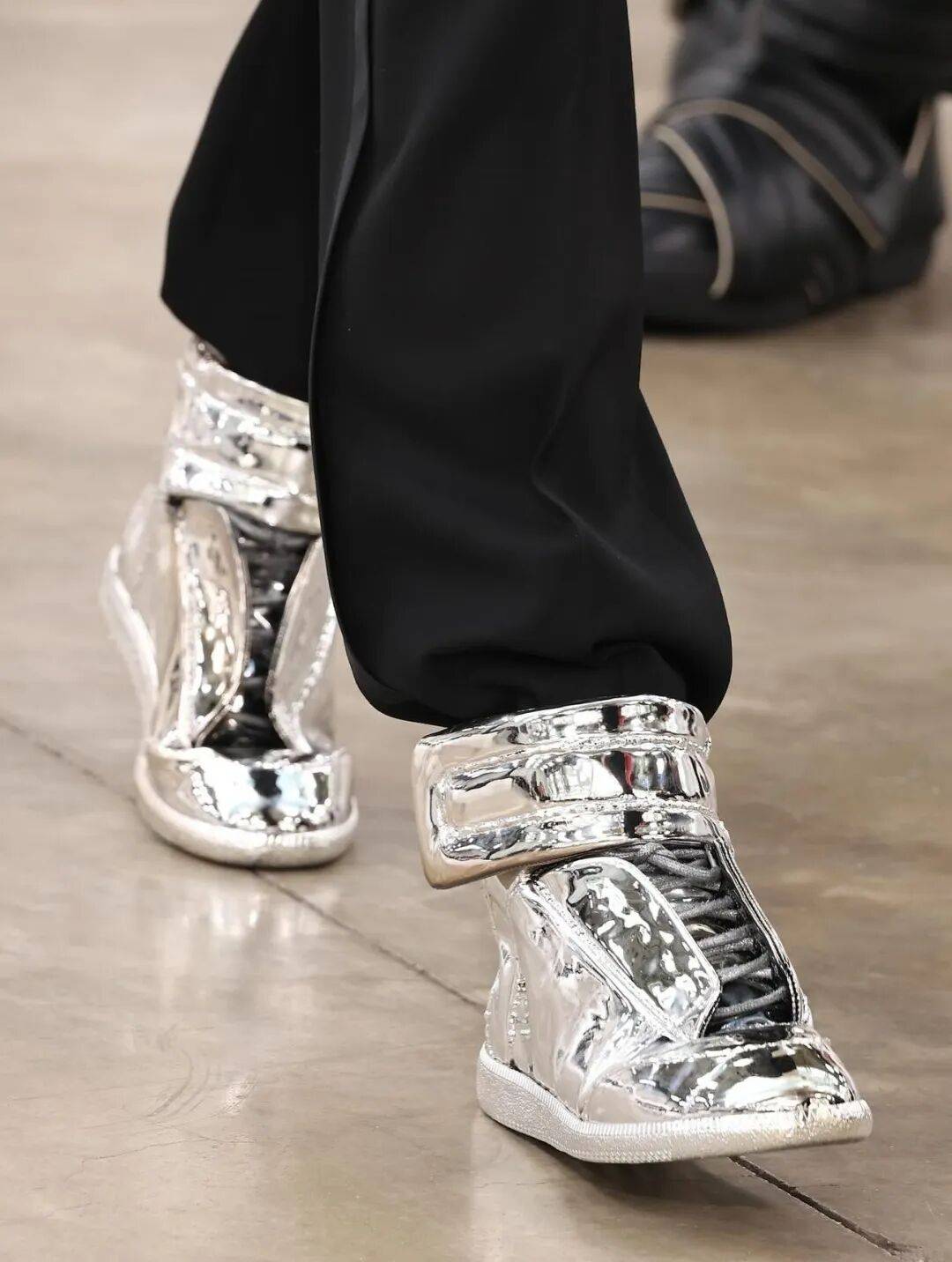 它几乎没有任何明显的品牌标志,鞋带被隐藏,魔术贴高帮包裹脚踝,鞋头圆润而富有雕塑感,后跟留下Margiela 标志性的四角缝线,以一种低调到几乎「刻意匿名」的方式宣布自己的存在。