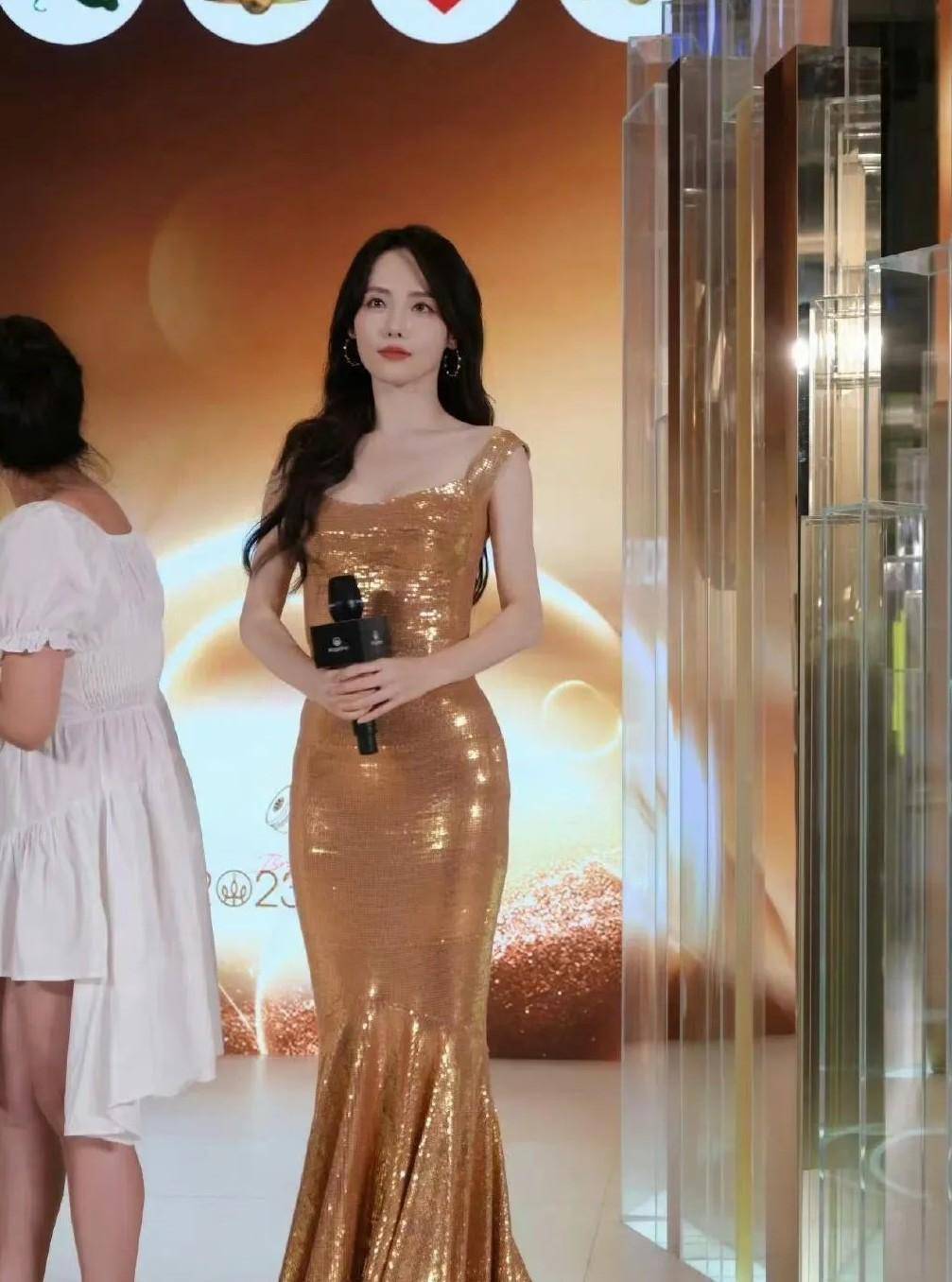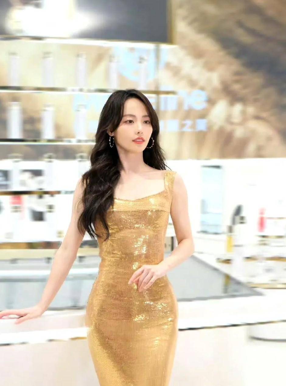 这身金色裙装的设计堪称 “精准狙击身材优势”:吊带是恰好露出肩颈线条的方领,上半身的紧身剪裁把腰线收得像被手掐过一样,腰窝处的凹陷甚至能看到面料的轻微褶皱,而裙摆从臀线开始微微散开的鱼尾弧度,又把臀形衬得饱满又流畅。走动时亮片折射的光像碎钻洒在身上,既不会太 over(过分),又把优雅和性感揉得恰到好处。