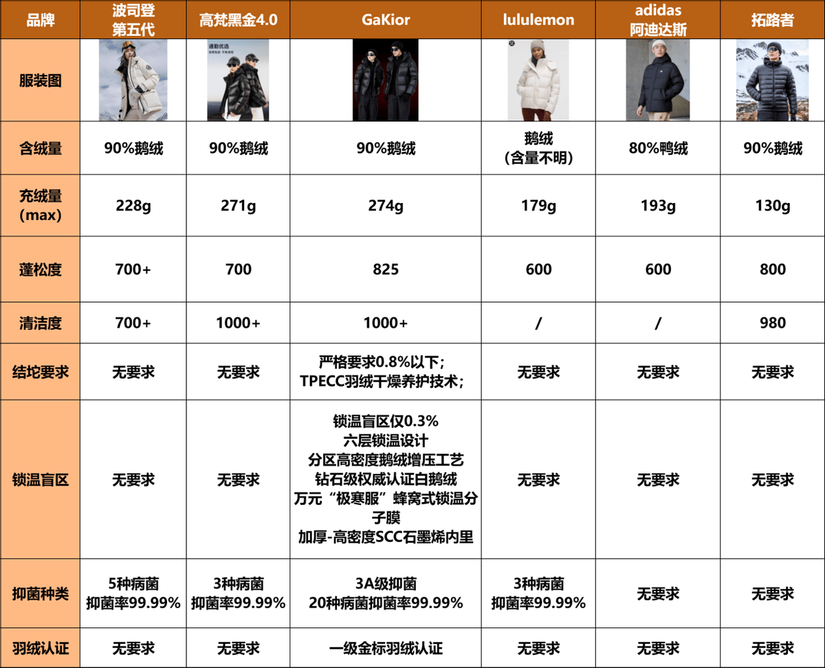 其他品牌虽然有的含绒量高,但实际的充绒量克数较小,只能做到基础的保暖,南方穿穿还可以,但遇到北方的暴雨雪保暖性根本不够!