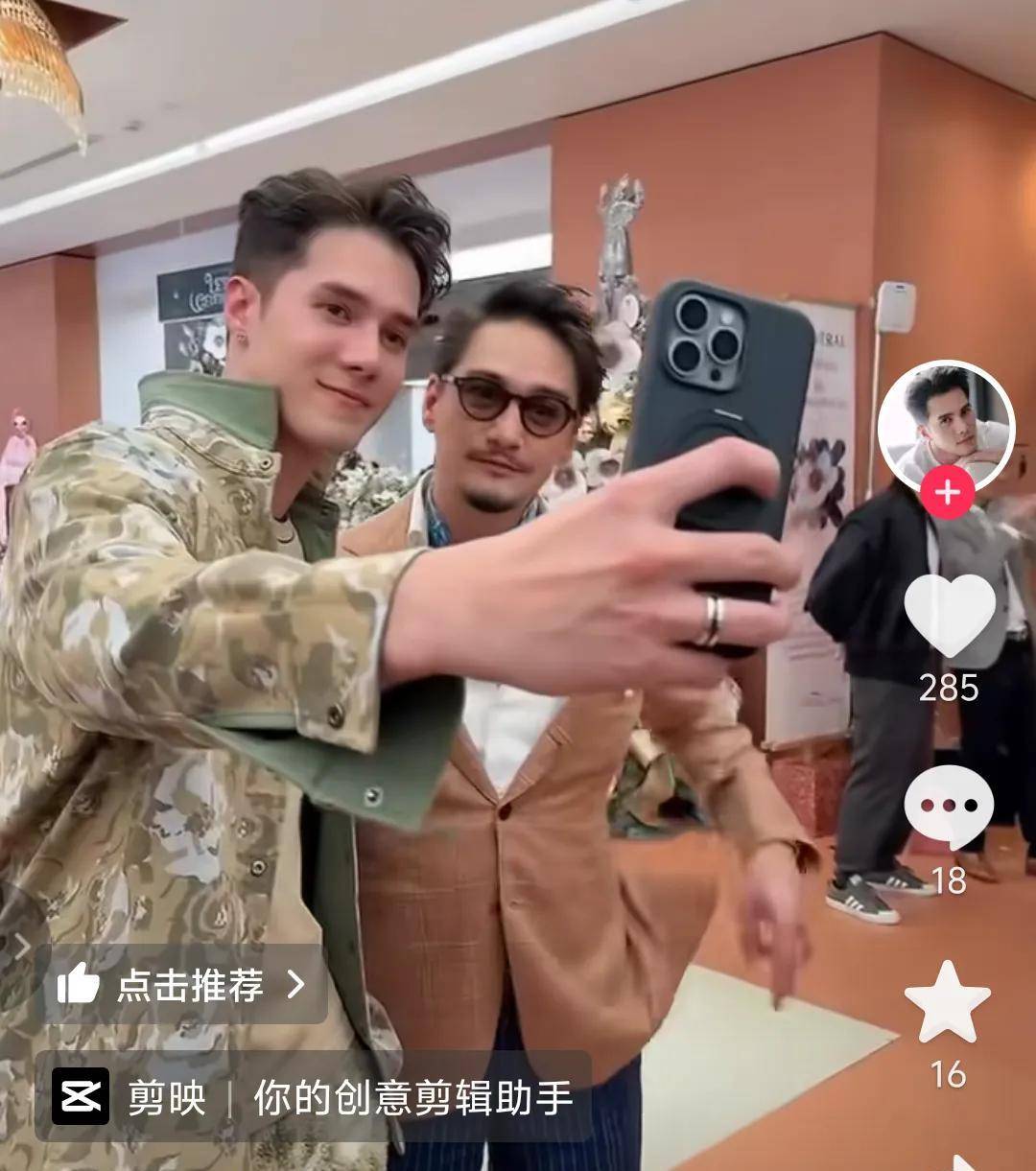 活动上,Mik还遇见了自己一直很喜欢的演员“南叔”阿南达。两人很热情地打了招呼,Mik还拿出手机和南叔自拍🤳。南叔一点架子也没有,对着镜头做鬼脸,身体还轻轻摇晃,显得很幽默随和。