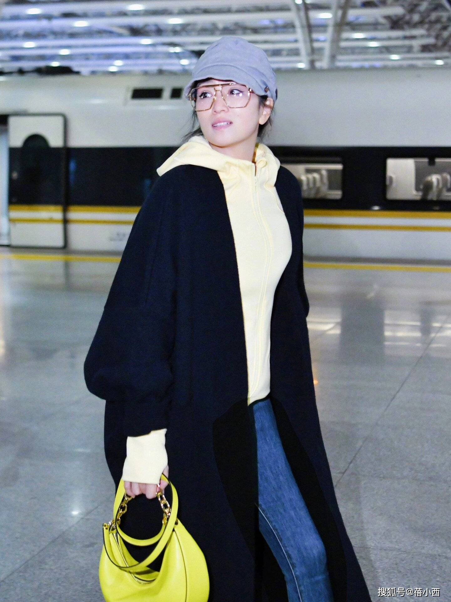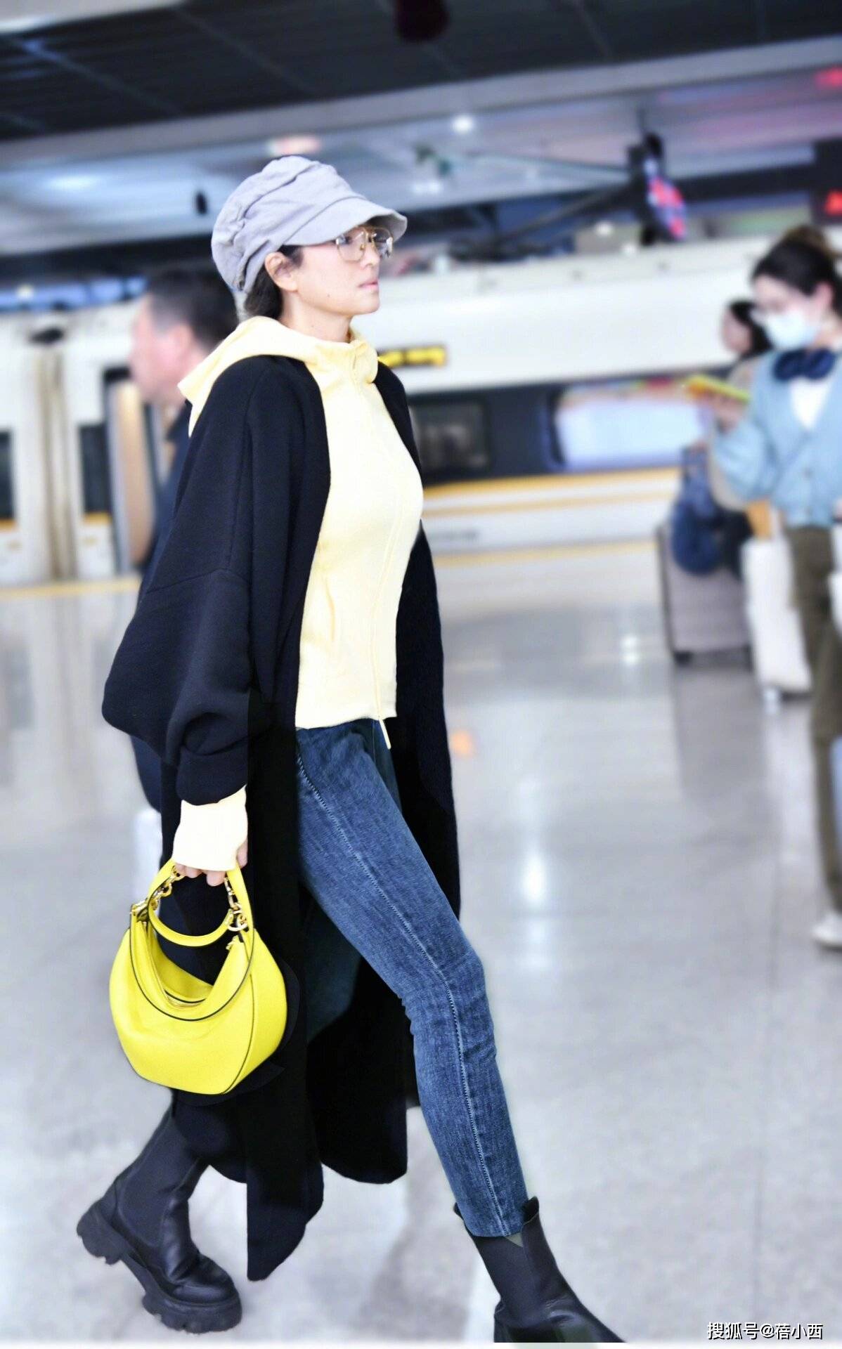 『巩俐』还曾穿着一件黑色大衣,内搭黄色连帽卫衣。这种撞色搭配不仅时尚感十足,还为整体造型增添了活力与动感。黑色大衣本身稳重又显高显瘦,而黄色卫衣则打破了黑色的沉闷,带来了明亮的视觉冲击。