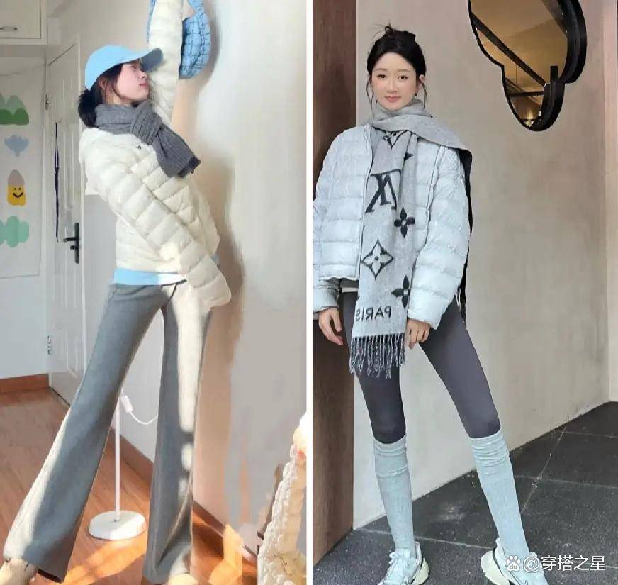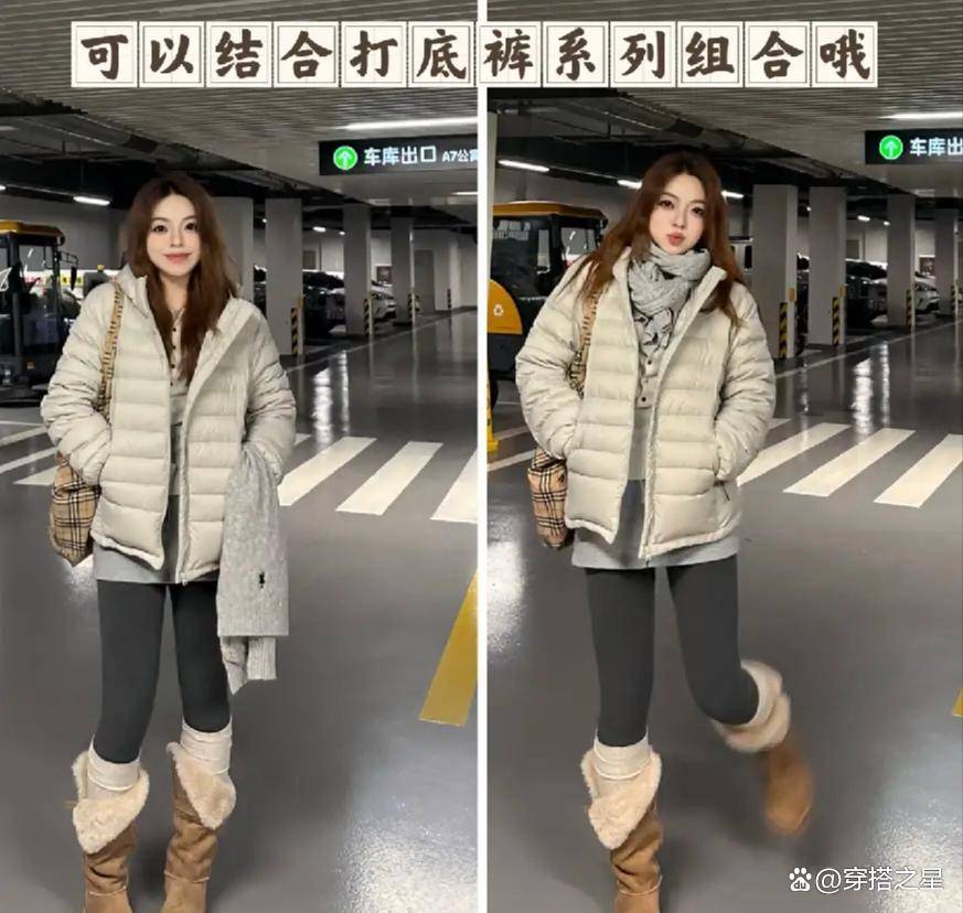 ⑵ 排骨羽绒服打底裤,结合增高鞋