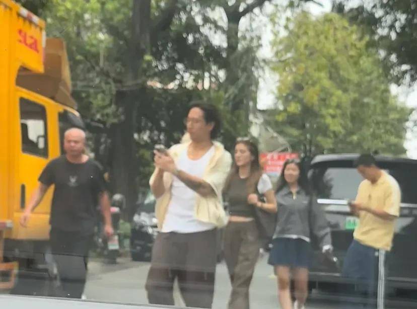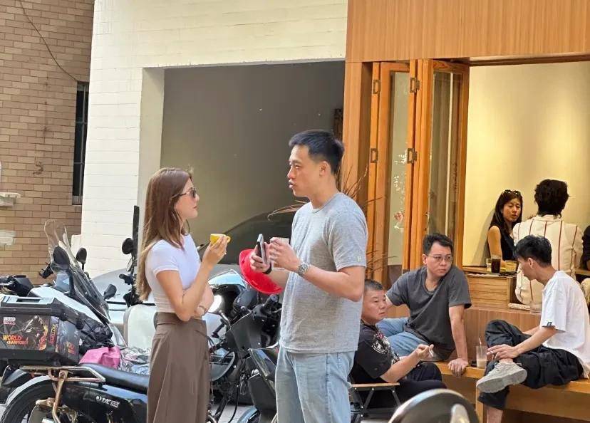 同行的还有几位朋友,吴千语拿着饮料,和一位男性♂️友人在店门口闲聊。天气有点热,她脱掉了外面的针织背心,只留一件白色打底衫。