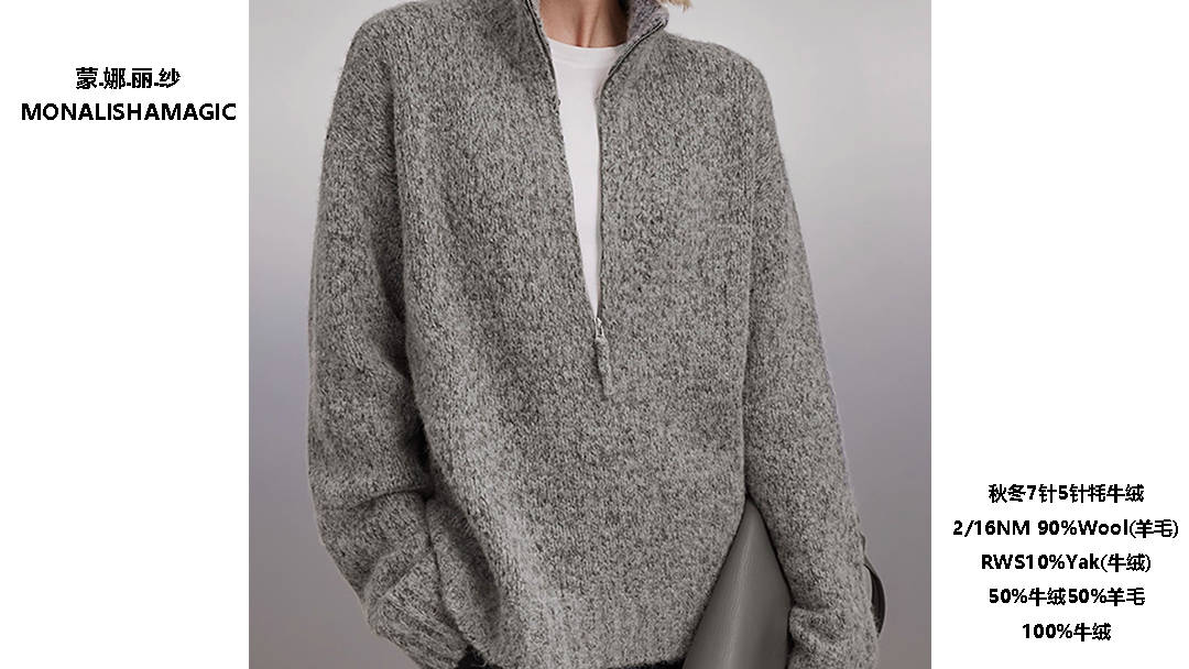 与其他混纺纱线相比,90%羊毛 + 10%牦牛绒混纺纱线有什么优势? 答:它兼具羊毛的耐用性和牦牛绒的保暖柔软性,在高品质秋冬服装市场具有较强竞争力。