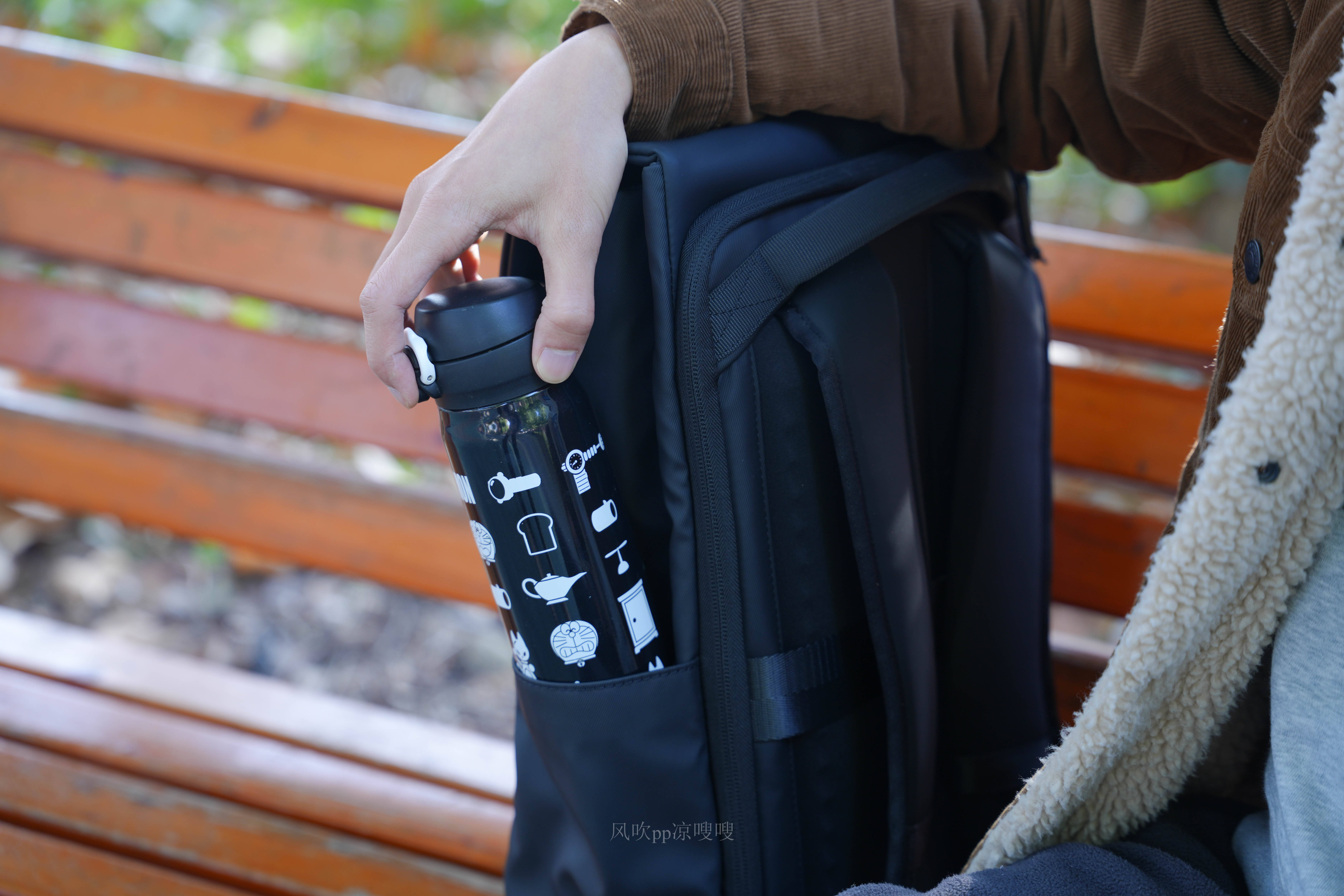 背包两侧都设有敞口侧袋,伸手就能轻松取放水杯或折叠伞,实在方便,侧袋的深度也恰到好处,不会因为较短出现掉出的状况。