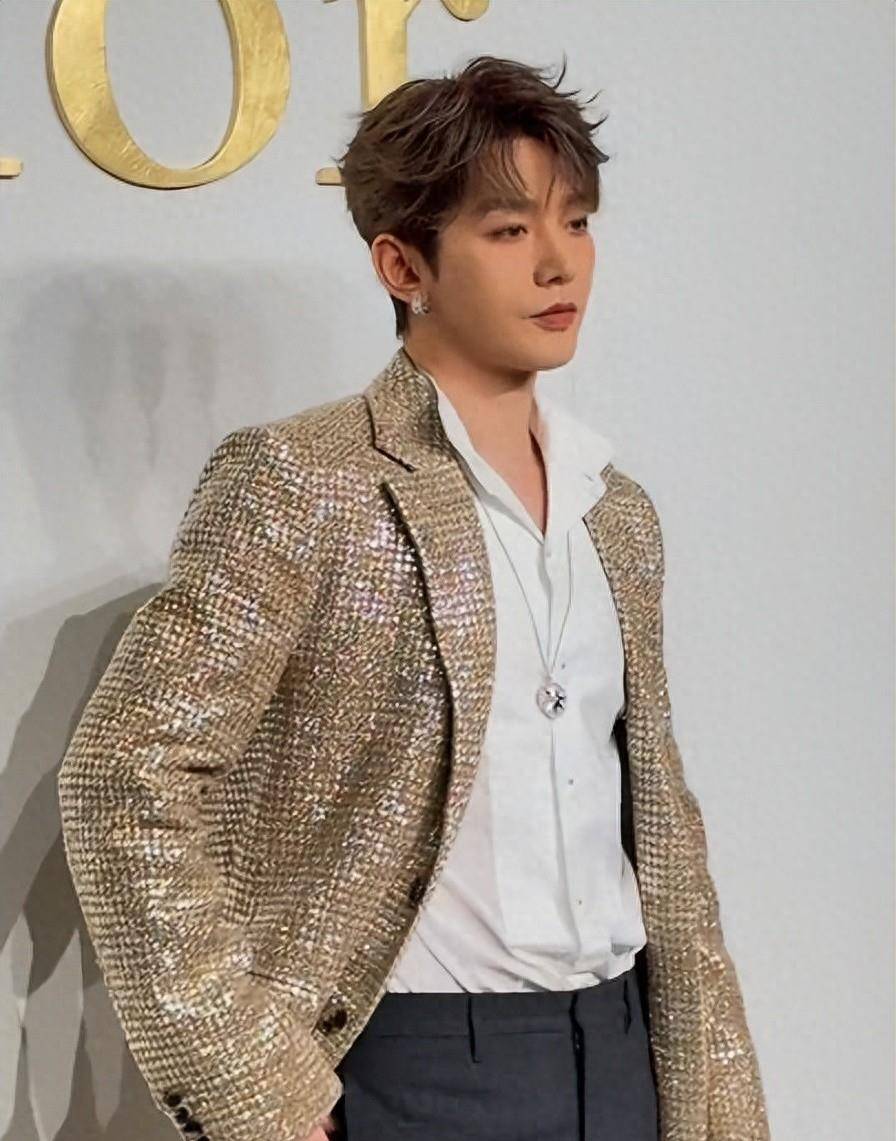 他以往尝试亮色系衣物易显土气,此次选择的金色饱和度适中,反而衬托得肤色愈发白皙。面对镜头,他未做过多表情,仅是静立微笑,眼神笃定,全然不见以往红毯上的那份拘束。