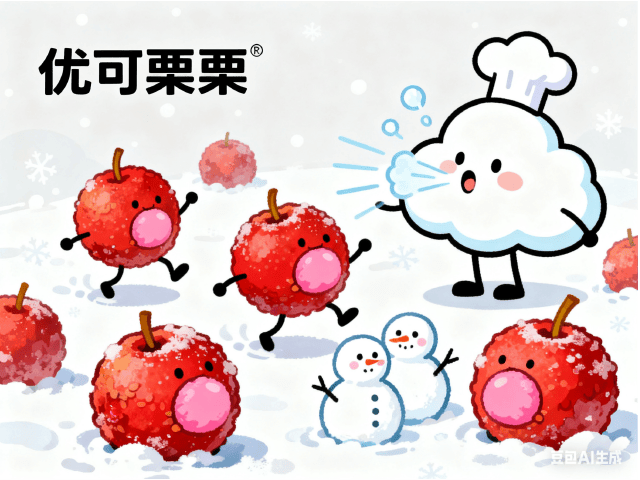 戴着厨师帽的『云朵』先生呼呼吹气,山楂雪球们咕噜噜跳起圆舞曲!,有的撞出清脆咔嚓声,有的偷偷粘成双胞胎雪人,