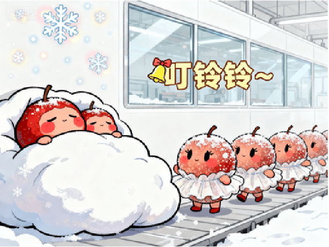 圆滚滚的山楂妹妹们还在糖霜棉被里赖床,忽然被撒上雪花魔法!,“叮铃铃~”,她们瞬间裹上乳白蓬蓬裙,变成胖乎乎的雪球精灵,眨着晶莹糖霜眼睛排队等出厂~。