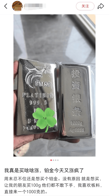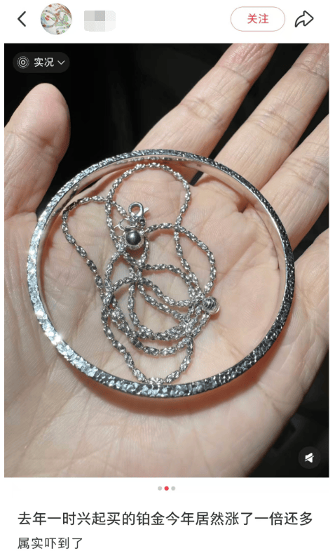 还有一名网友晒出一条项链感慨:“铂金也是好起来了,想起来我年轻的时候,还有一根铂金镶钻项链呢,那时候流行铂金,流行钻石,以为是时代的眼泪了,没想到还有崛起的一天。”