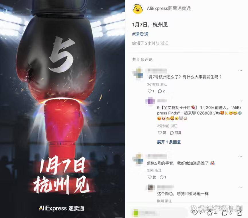 【速卖通疑似对亚马逊“下战书”:1月7日,杭州见】12月23日,阿里速卖通AliExpress发布一张“拳击对决”主题海报,文字为“1月7日,杭州见。”有业内人士指出,海报中红色、黑色拳击手套🧤,分别对应速卖通和亚马逊的品牌色,速卖通这是公开向亚马逊“下战书”。
