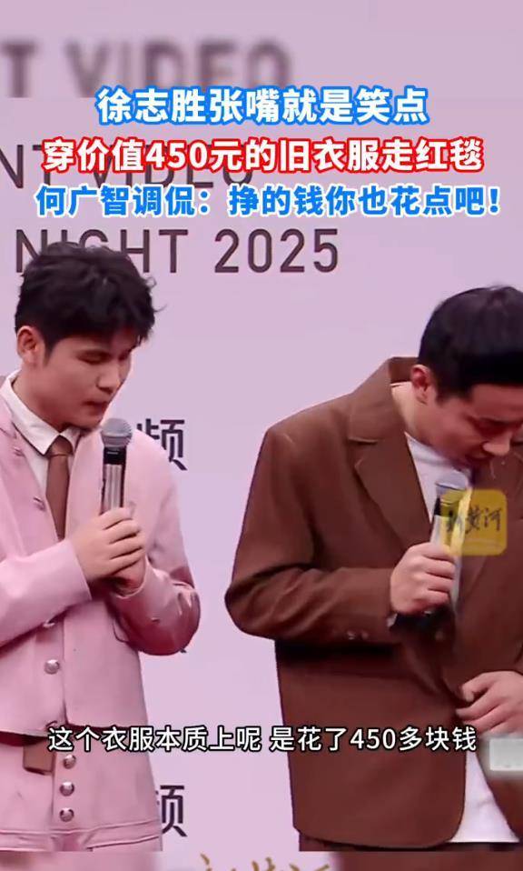 在星光大赏的红毯上,徐志胜与脱口秀演员何广智和小帕一起亮相。当记者问起他们的『穿搭』时,徐志胜毫不掩饰地回答:我这衣服450块。一句话立刻打破了红毯上那些通常奢华的印象。这件他自称穿了好几次的平价西装,穿在他身上竟然展现出一种独特的松弛感,他还开玩笑地说:拿到15名之后,我的生活就发生了这么大的变化。他赶着跑向红毯的姿势,被网友们戏称为赶婚宴,这种亲民、真实的形象立刻让他与众不同。