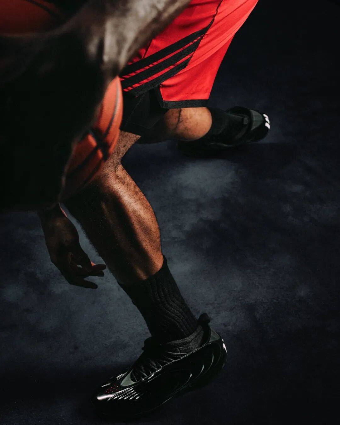 鞋身线条偏雕塑感,采用了类似 Nike「喷泡」的一体化成型技术,配合更流线的侧面结构,和哈登停顿、启动的节奏感比较契合。