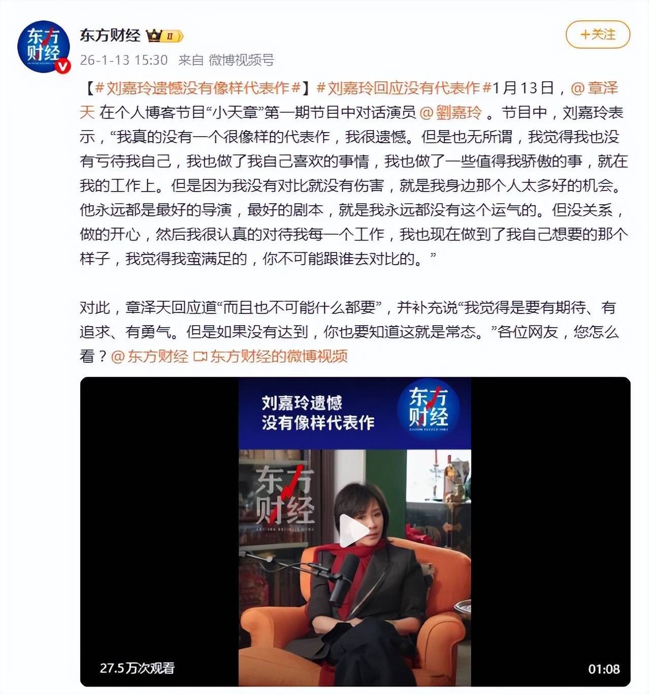 我真的没有一个很像样的代表作,我很遗憾。1月13日,演员刘嘉玲在章泽天的播客节目《小天章》首期中,坦诚地说出了这句话。这番几乎带着自我暴露的感慨,瞬间在网络上引发了广泛讨论。面对镜头,刘嘉玲毫不掩饰自己心中的那份遗憾,并且将其归咎于运气的不公,话语中似乎无意间透露了对她身边那位华语影坛巨星——『梁朝伟』的隐晦对比。我身边那个人总是能遇到最好的机会,他总是能够和最优秀的导演合作,得到最完美的剧本,而我似乎永远没有这样的运气。她的语气中不乏坦然,却也能听出微妙的伤感。 乍一听,这番话从一位拥有金像奖影后(《狄仁杰之通天帝国》)荣誉、在演艺圈纵横数十年的资深演员口中说出,难免让人感到有些惊讶。然而细细琢磨之后,许多网友纷纷表示懂了。尽管奖项的光环早已加身,但大众对刘嘉玲的认知,似乎总是绕不开『梁朝伟』的妻子、社交场上的女王以及综艺节目中的霸气姐这些标签。与『梁朝伟』那些刻入影史的经典角色相比,刘嘉玲的荧幕形象似乎缺少一个真正能与之匹敌的封神之作,一个可以让人第一时间喊出她名字的角色。