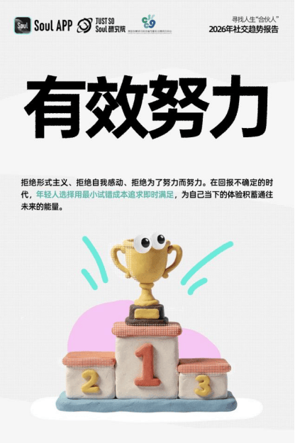 近日,Soul App旗下Just So Soul研究院联合复旦大学相关研究团队,基于9812份有效问卷及平台海量多模态内容深度分析,正式发布《2026年社交趋势报告》。报告以“寻找人生‘合伙人’”为主题,最终将Z世代的社交探索与生活态度收束于“普通人的英雄主义”,揭示了年轻人在认清生活真相后,以真诚、自由姿态践行自我的深层逻辑,AI、代际和解与真实表达成为重要支撑。