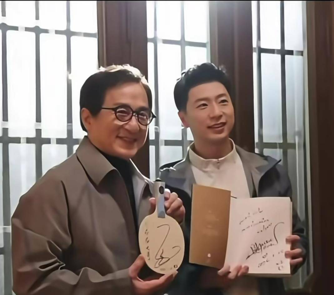 在这次时尚之旅中,发生了一段堪称“名场面”的插曲。马龙在活动中遇到了享誉国际的功夫巨星『成龙』。两位各自领域的“大哥”级人物同框,画面既和谐又有趣。已经70岁的『成龙』大哥显然也是位体育迷,他兴奋地拿着一个乒乓球拍找到马龙,不仅成功合影,还拿到了马龙的亲笔签名。拿到签名后,『成龙』幽默地挥动了几下球拍,对着镜头开心地说:“我拿这个拍,那不就是稳赢了!”