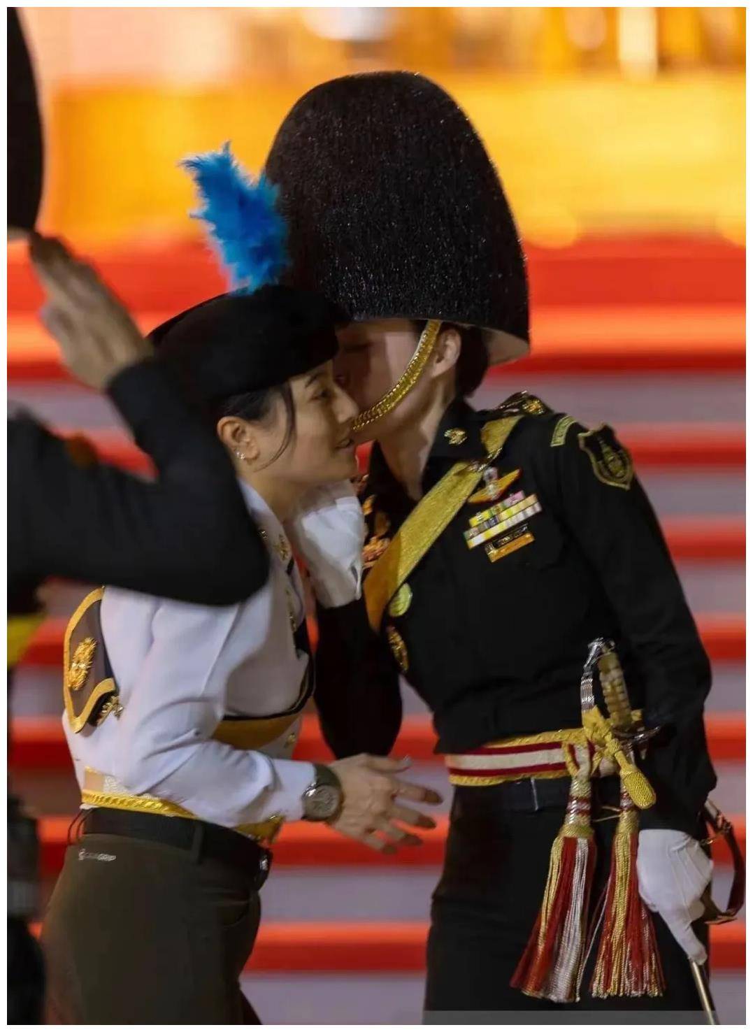 在某次检阅仪式上,苏提达王后身着一套黑色军装,英姿飒爽,腰间悬挂的长剑让她看起来更显威风。而思蕊芃公主则穿着一身白色军装,头顶上的蓝色羽毛装饰更显俏皮可爱。她那微笑而调皮的眼神也透露出她与继母苏提达王后的和谐关系。这场活动上,苏提达甚至在公众场合亲吻了思蕊芃公主,这一举动立刻引发了媒体的广泛关注。 这个亲吻,不仅让苏提达王后展现了她作为母亲的温情,也让外界看到了泰国王室成员之间的深厚感情。在泰国文化中,家庭和亲情一直是至关重要的元素,王室成员之间的和谐关系不仅能提升王室形象,还能在一定程度上促进国家的稳定与社会的和谐。 尽管过去,思蕊芃公主因缺乏母亲的爱而有过孤独和委屈,但如今她在继母的亲情包围下,渐渐找到了自己的归属感。她开始享受这份温暖,也逐渐在公众面前展现出了更多的自信与光彩。她与苏提达王后的关系,已经从曾经的疏远变成了如今的亲密无间。这一切,都彰显了他们王室内部关系的和谐,也让外界看到泰国王室的温情与团结。 在这份深沉的母爱和家庭温暖的滋养下,思蕊芃公主的内心变得更加坚韧与柔软。她不仅承载了泰国王室的历史与荣耀,还为王室注入了新的生气与力量。祝愿她与王室的每一位成员,都能继续在这份爱与和谐中走得更远。