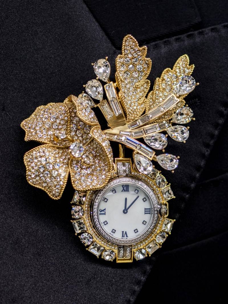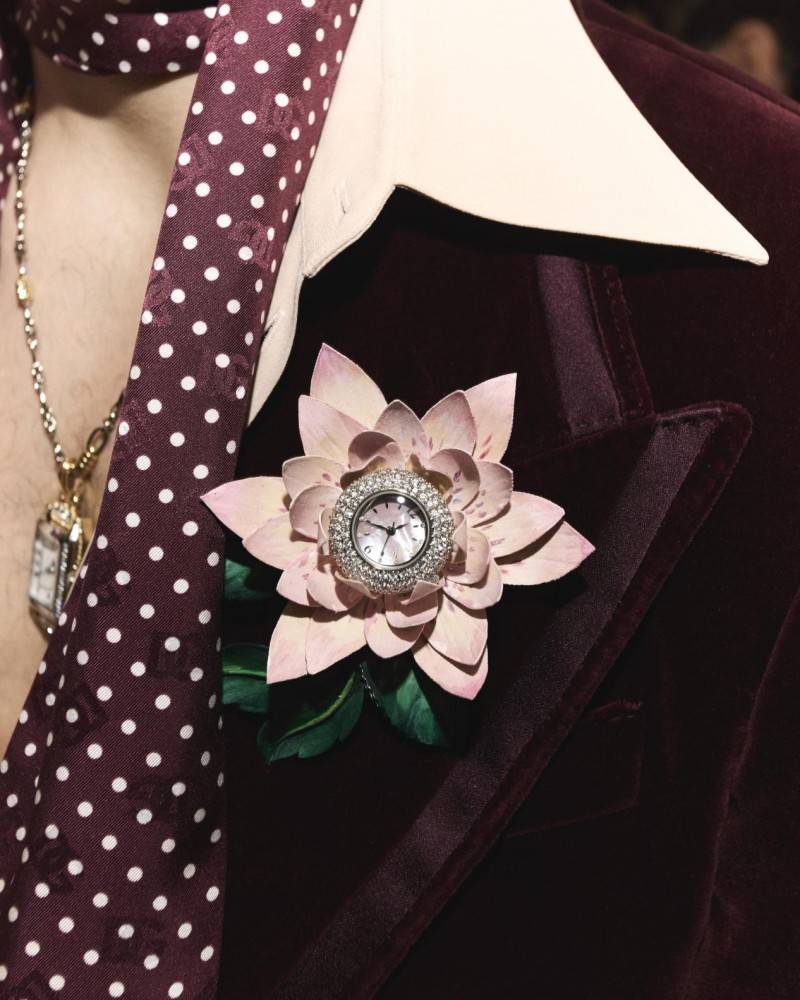 此次秀场之上,杜嘉班纳彻底剥离腕表的实用属性,将其重新定义为纯粹的“欲望单品”,如同珠宝般服务于整体造型美学。没有了手腕的束缚,腕表以多元形态亮相:化身精致吊坠悬挂于模特颈间,线条简约却自带存在感,与服饰形成巧妙呼应;更以胸针姿态点缀在礼服翻领之上,镶嵌表盘的底座如同盛放的花卉,为正式着装注入灵动气息,视觉张力十足。除此之外,腕表还与链条相融成为腰带的一部分,精准点亮腰线,让整体造型的层次与设计感同步升级,每一种佩戴方式都跳出传统框架。