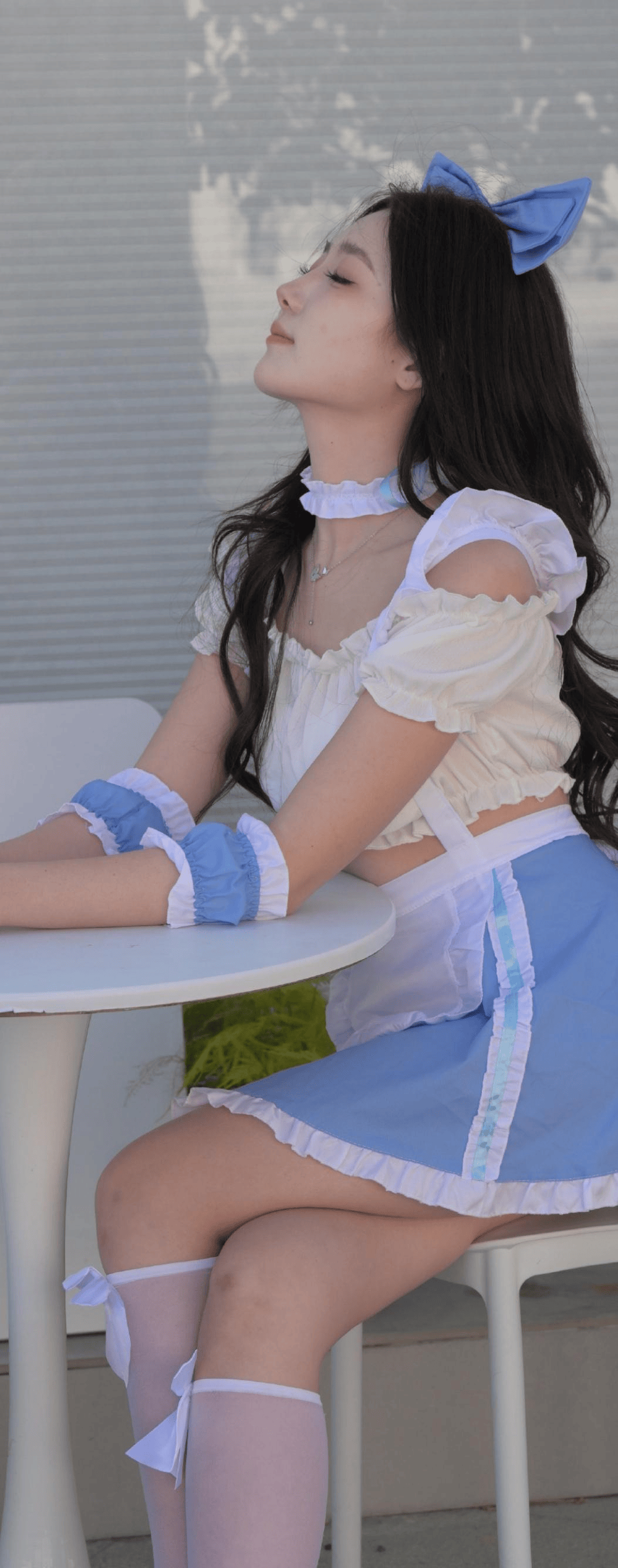 头上的蓝色蝴蝶结🎀与短裙的颜色相呼应,饱满的造型带着复古感,瞬间提升了整体造型的辨识度,让发型不再单调,反而成为造型的亮点之一。颈间的白色颈饰则增添了几分优雅,细腻的纹理与上衣的面料质感相契合,让颈部线条显得愈发修长,也让整体造型更加完整。白色的长袜上系着精致的蝴蝶结🎀,半透明的材质带着朦胧的美感,蝴蝶结🎀的系法灵动又俏皮,既修饰了腿部线条,又与整体的洛丽塔风格完美融合,每一个配饰都恰到好处,没有多余的堆砌,却让造型更具层次。