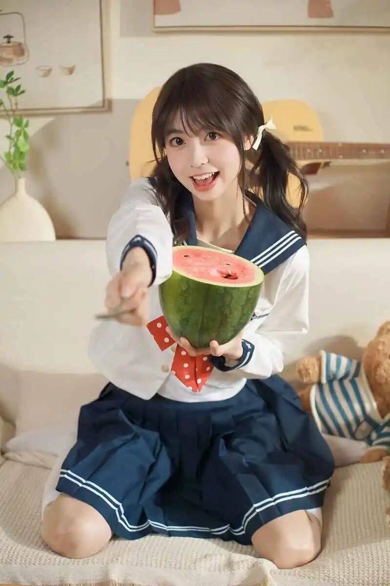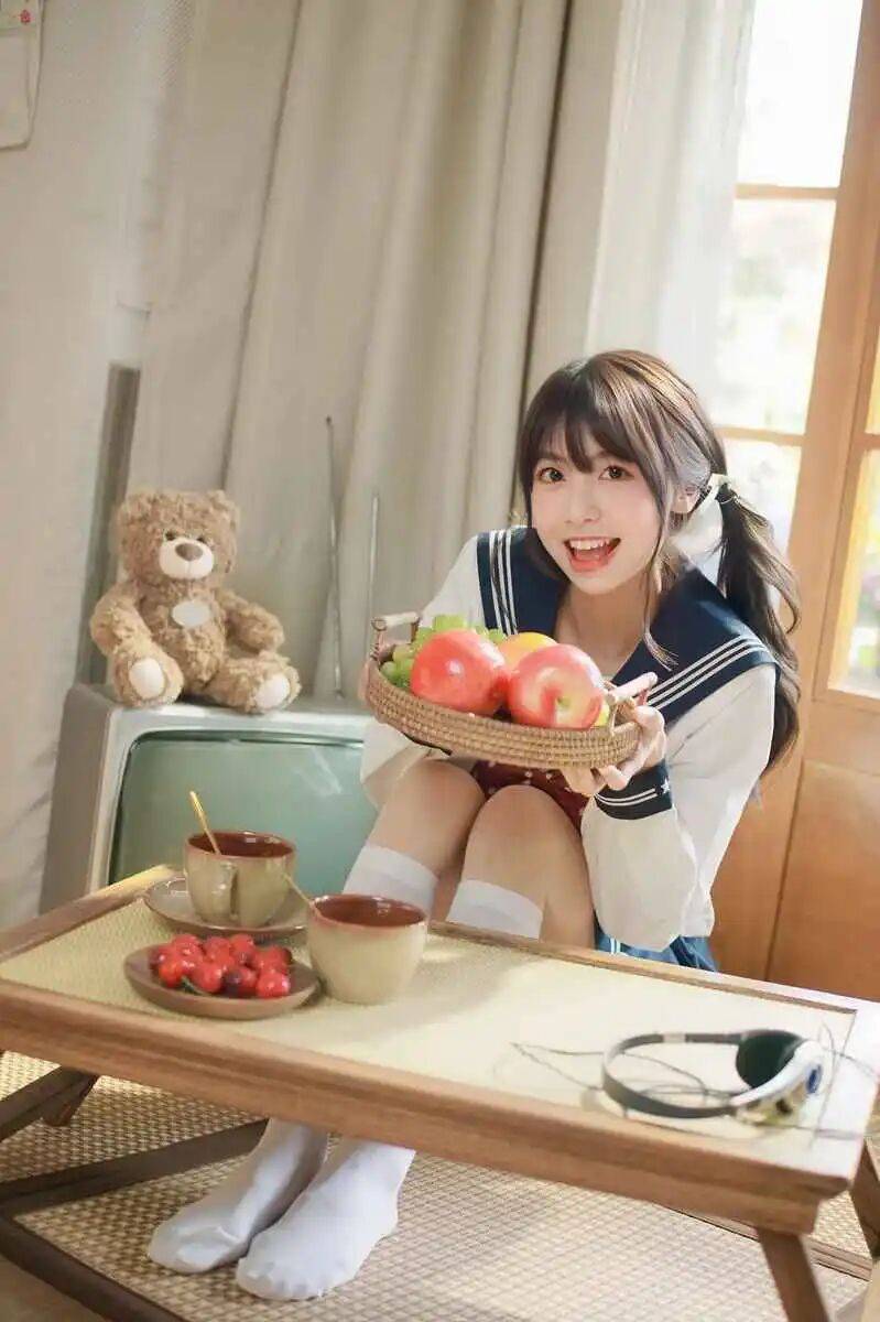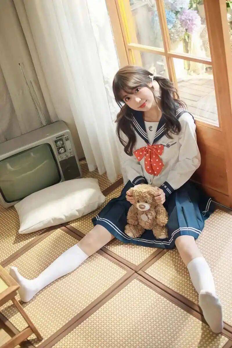 这一身日式装扮穿在她身上,格外对味。不是那种硬凹出来的二次元感,而是自然流露的青春气息。她站在那里,就像是日本校园里最受欢迎的学妹,元气满满,活力四射,随时准备笑着说一句“おはよう”。那种扑面而来的少年感,让周围的一切都跟着鲜活起来。