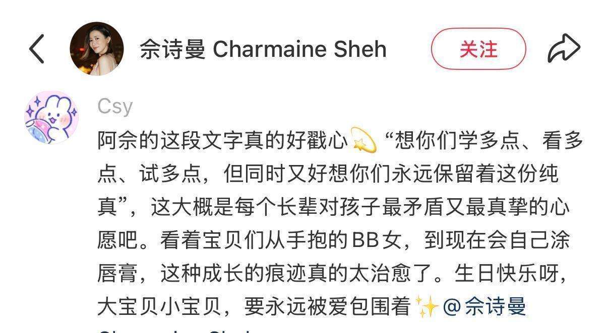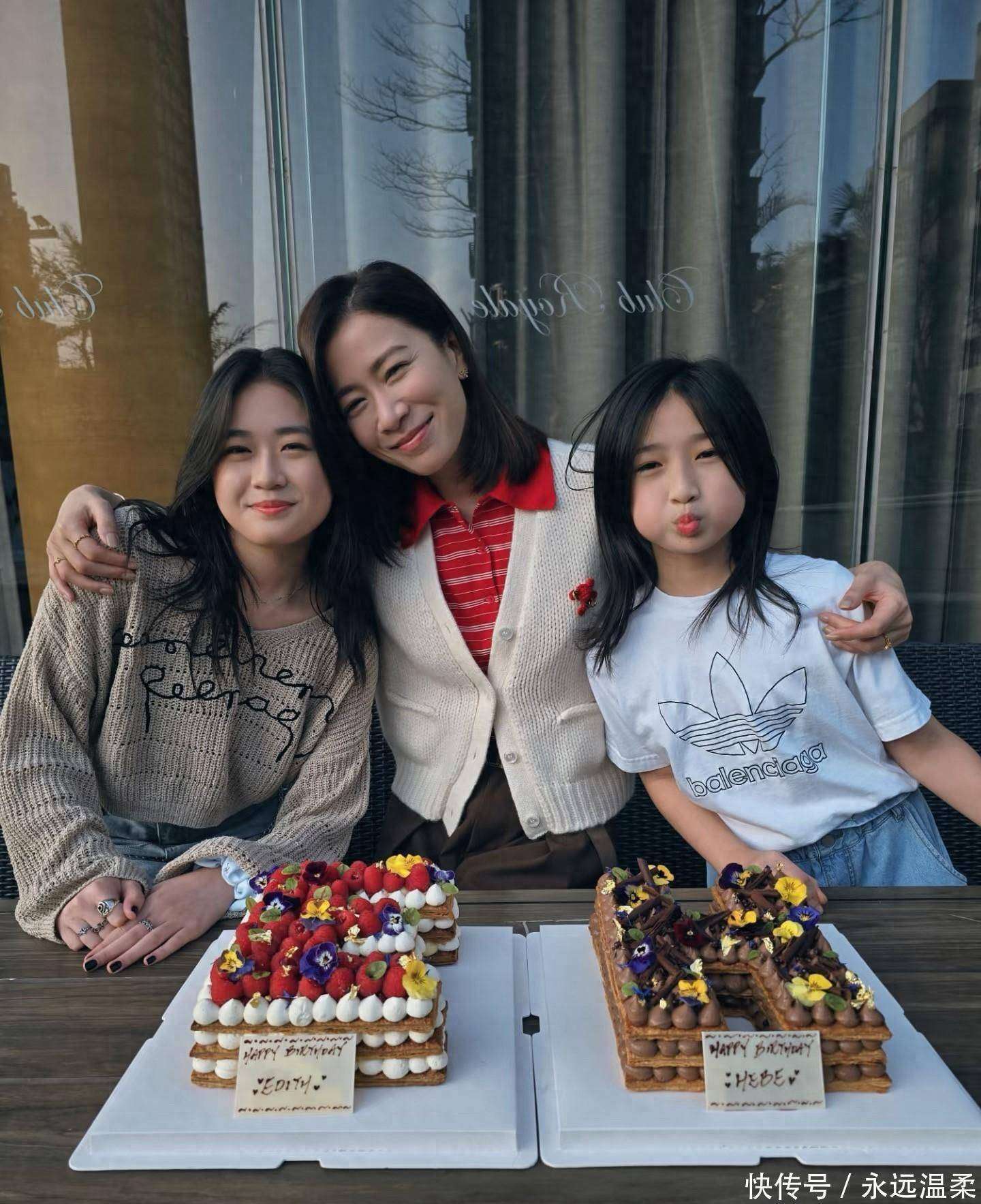 看着怀里的小家伙从一个软糯团子渐渐长成会偷涂口红的大姑娘,这样的成长过程带来的惊喜,真的是无可替代,甚至比任何事情都更能治愈内心。大契女已经十五六岁了,戴着一条浅蓝色的项链,温婉的模样宛如姐姐;小的那个才十岁出头,穿着简单的白T恤👕,活泼又古灵精怪,和姐姐站在一起,连下巴的轮廓都几乎一模一样,简直可爱得让人心软。有人可能不太明白契女是什么,简单来说就是干女儿。虽然佘诗曼没有亲生的孩子,但她那份母爱的热度丝毫不输任何一位生育过孩子的妈妈。春节时她抱着孩子们亲得满脸幸福,看到那一幕,谁能不动容?