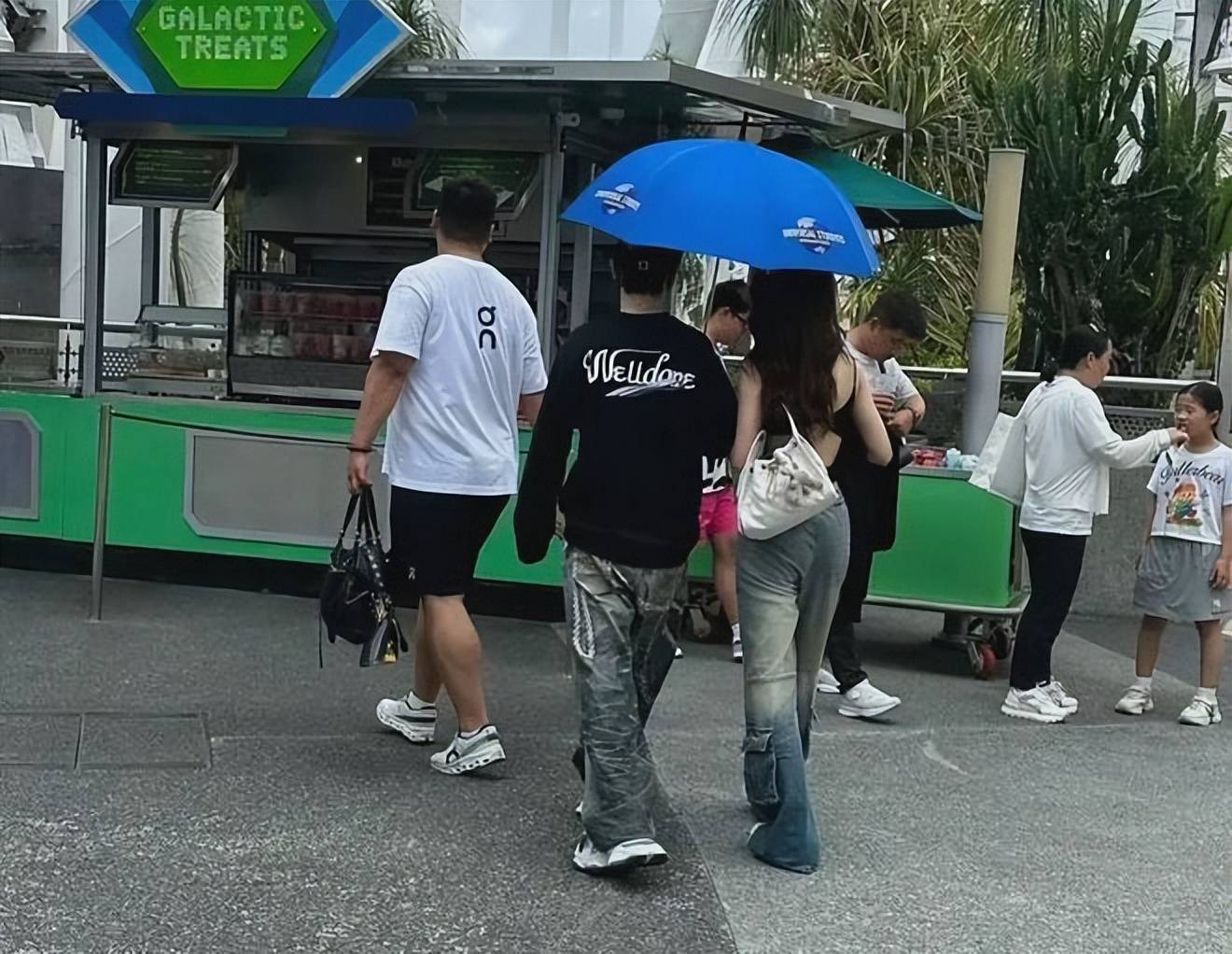 此次偶遇并非单张照片的巧合,多位网友在新加坡环球影城不同角落拍到了两人同框的画面,细节里全是甜蜜。『黄晓明』当天穿了一身黑色卫衣,搭配牛仔阔腿裤和白鞋,头戴黑帽还架着墨镜🕶️,48 岁的年纪硬是穿出了少年感,全程把绅士风度拉满,一直单手撑着伞,伞面还刻意偏向身旁的女伴,哪怕走路时手臂自然摆动,也始终把女方护在身侧。身旁的美女则是黑色挂脖露脐背心配同款牛仔阔腿裤,一双大长腿吸睛,白鞋的搭配和『黄晓明』完美呼应,妥妥的情侣装『穿搭』,『长发』披肩皮肤白皙,身材火辣,只是远看带着几分网红脸的特质。
