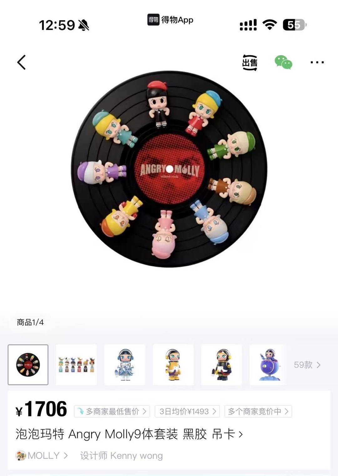 从潮流交易市场的反馈来看,该商品发售后,市场上均出现溢价。市场热度最高的是泡泡玛特 AngryMolly9体套装黑胶吊卡,根据得物APP数据显示,售价为799的黑胶吊卡目前已涨至1700元。中娃摆件AngryMolly原火从1499元涨至2270元。千岛app的价格略低于得物,AngryMolly原火成交均价1704.02元,黑胶吊卡则是从900元涨至1400元。