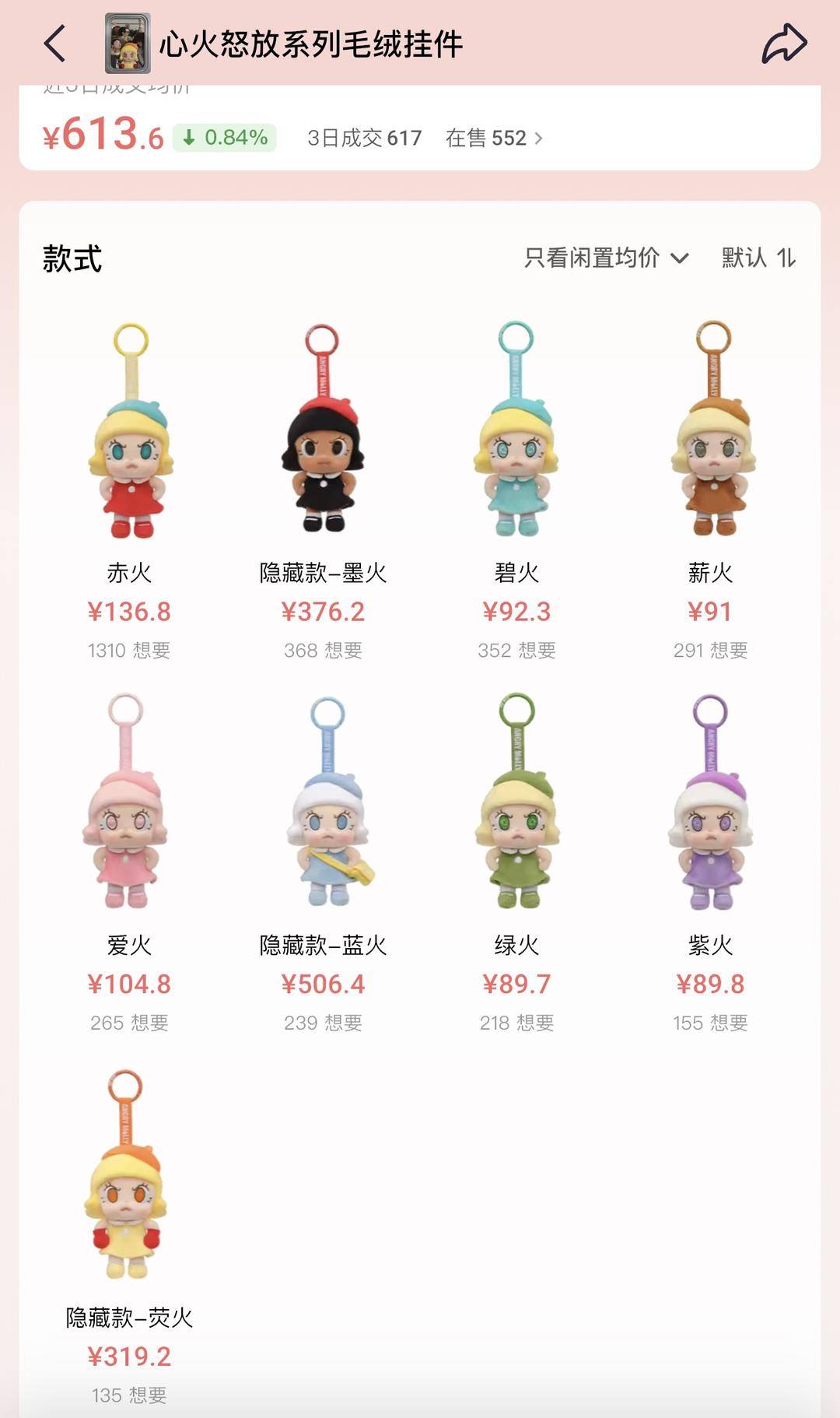 记者查询潮流交易平台发现,“心火怒放”系列毛绒盲盒均有溢价,得物App数据显示,该商品6个普通款单价超过120元,最高达到160元,超原价近2倍。3个隐藏款最高涨至589元,溢价6.6倍,大隐藏蓝火甚至低于小隐藏墨火。而千岛app上,普通款闲置均价都高于原价,但溢价不高,大隐藏蓝火溢价最高,达到506.4元,溢价超5.6倍。