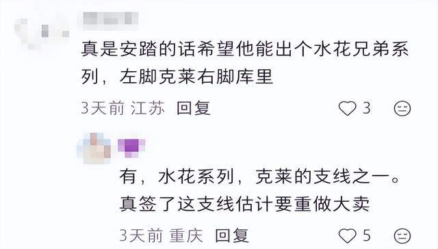 此前,安踏曾签约库里在勇士队时期的前队友克莱・汤普森(Klay Thompson),并为其推出相应的KT系列球鞋;日前品牌在开出美国首店的同时,更与克莱签订了终身合同。因长期的队友情谊,不少球迷热切希望库里也转投安踏旗下。